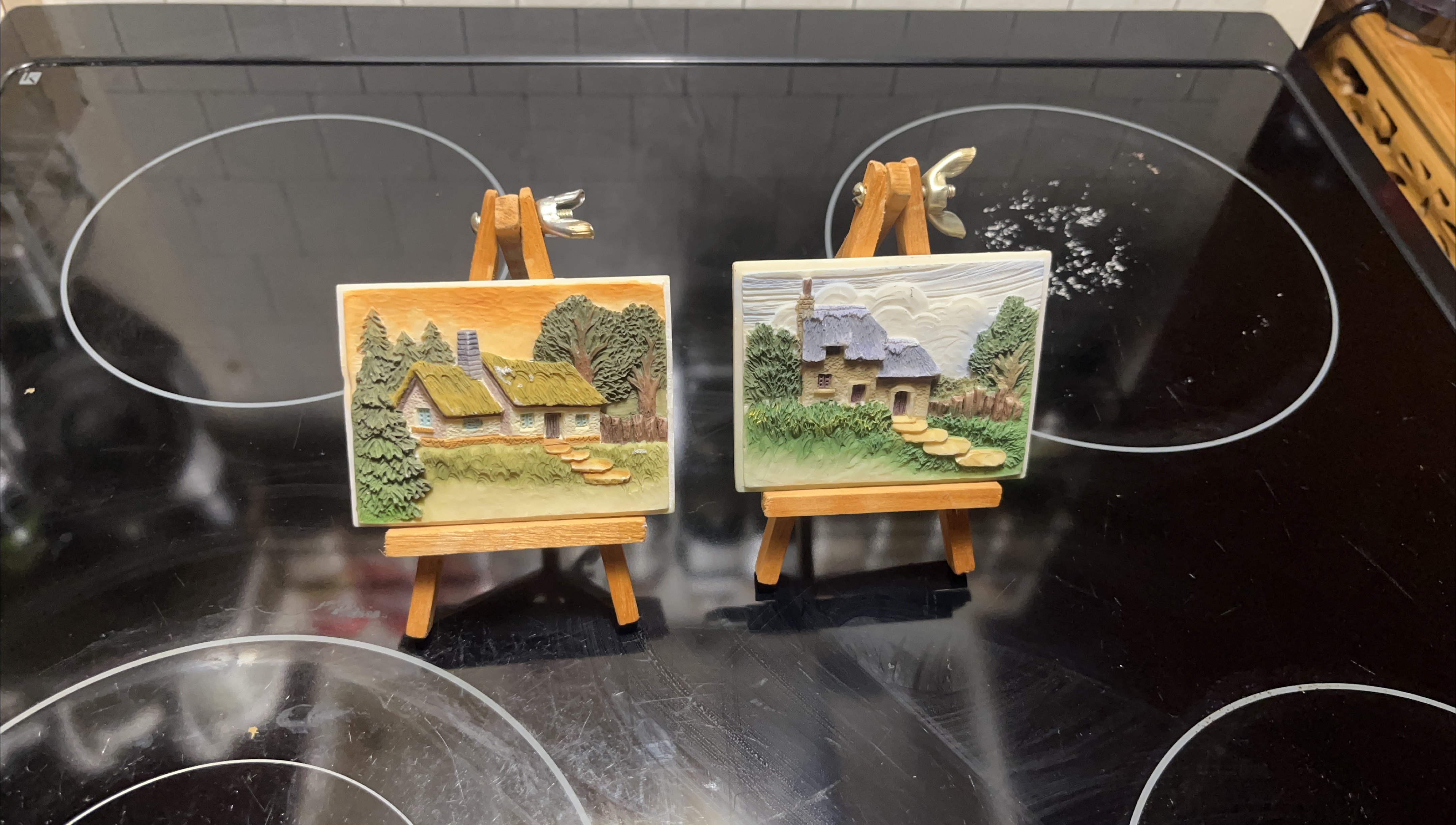 Two cute miniature cottage art pieces, each displayed on a small easel. They add a touch of charm to any space! They have a lovely, detailed design.