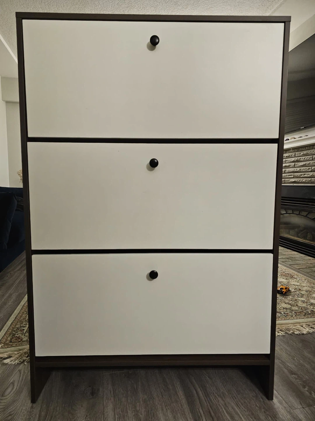 Selling a 3-drawer shoe cabinet in a stylish brown and white finish! It's perfect for keeping your entryway neat and organized. The cabinet measures approximately 80cm wide and 112cm high, with a depth of 24cm. It's a great way to store your shoes and keep them out of sight