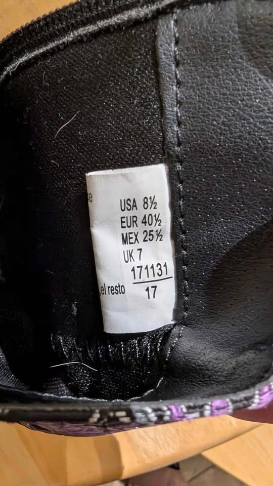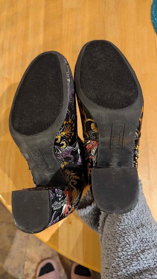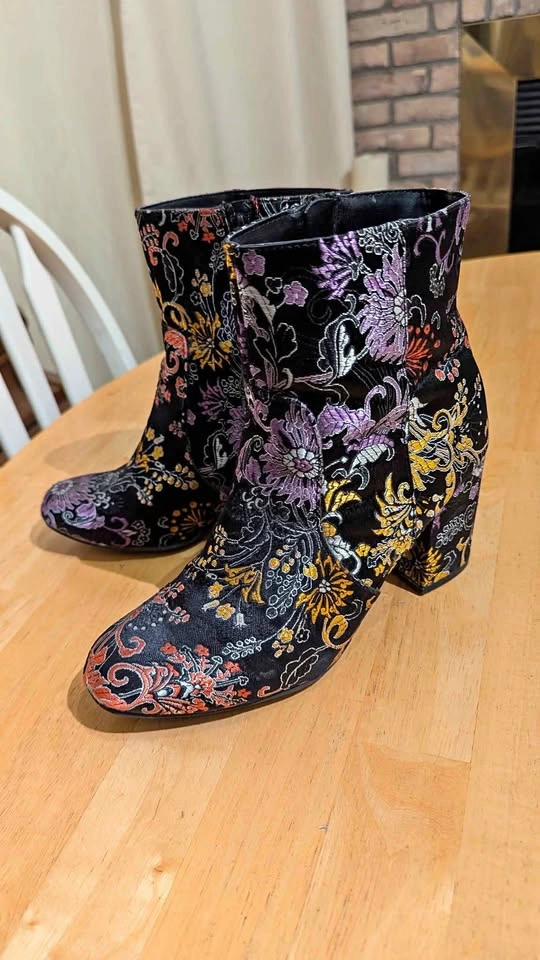 14Floral Black Orange Purple Red 3" Heeled Tapestry Booties with side zipper, Sz 8.5. Only worn a few times. These cute booties will make a statement. Pickup only, Morningside and Old Finch area, Scarborough.