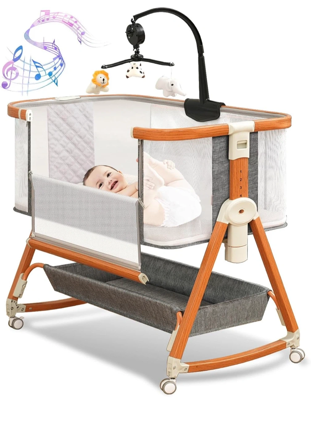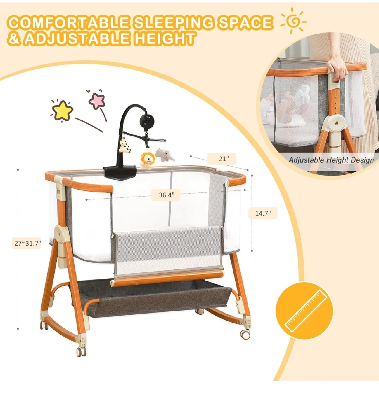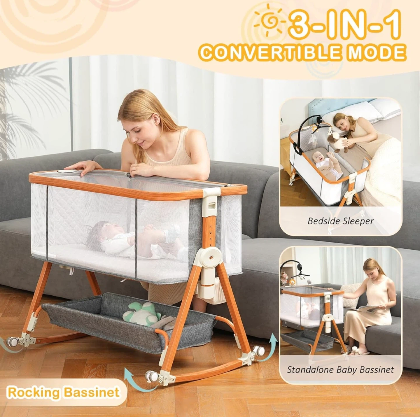 23This is a 3-in-1 convertible baby bassinet. It can be used as a bedside sleeper, a standalone baby bassinet, or a rocking bassinet. It has wheels for easy movement and adjustable height for convenience. The dimensions are 36.4" x 21" x 14.7".