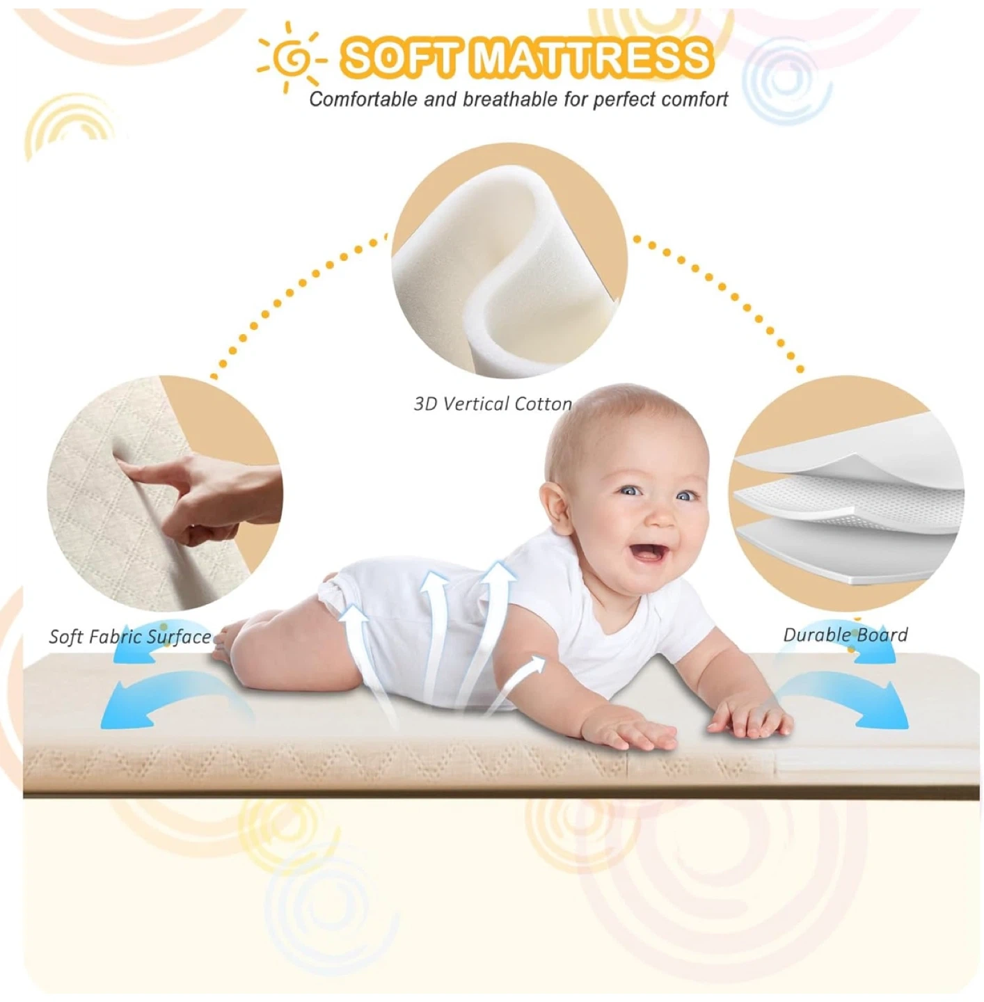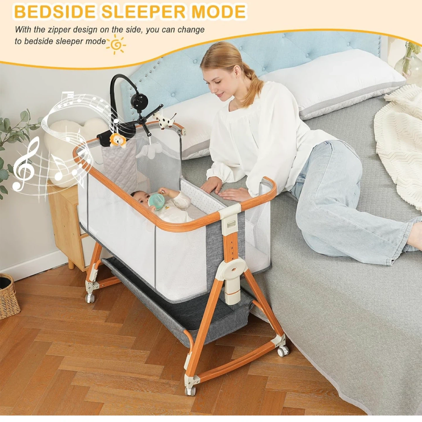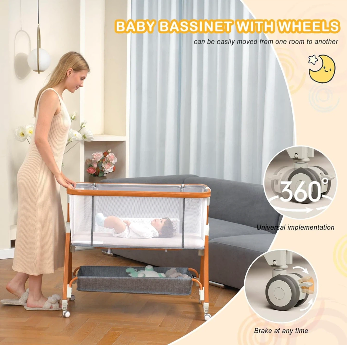 23This is a 3-in-1 convertible baby bassinet. It can be used as a bedside sleeper, a standalone baby bassinet, or a rocking bassinet. It has wheels for easy movement and adjustable height for convenience. The dimensions are 36.4" x 21" x 14.7".