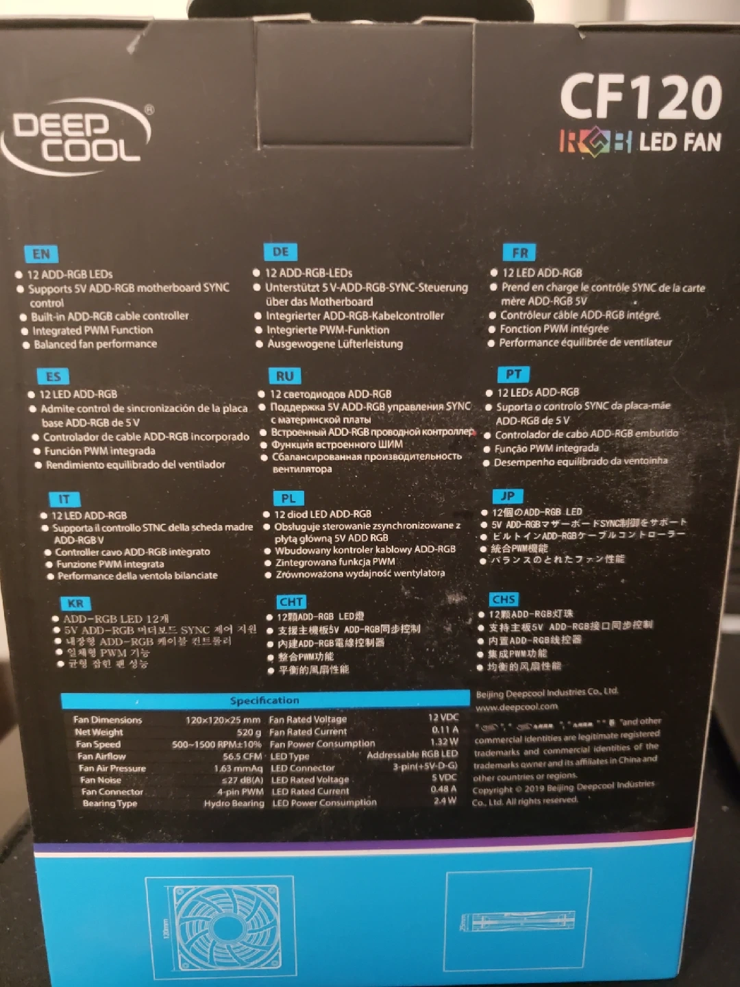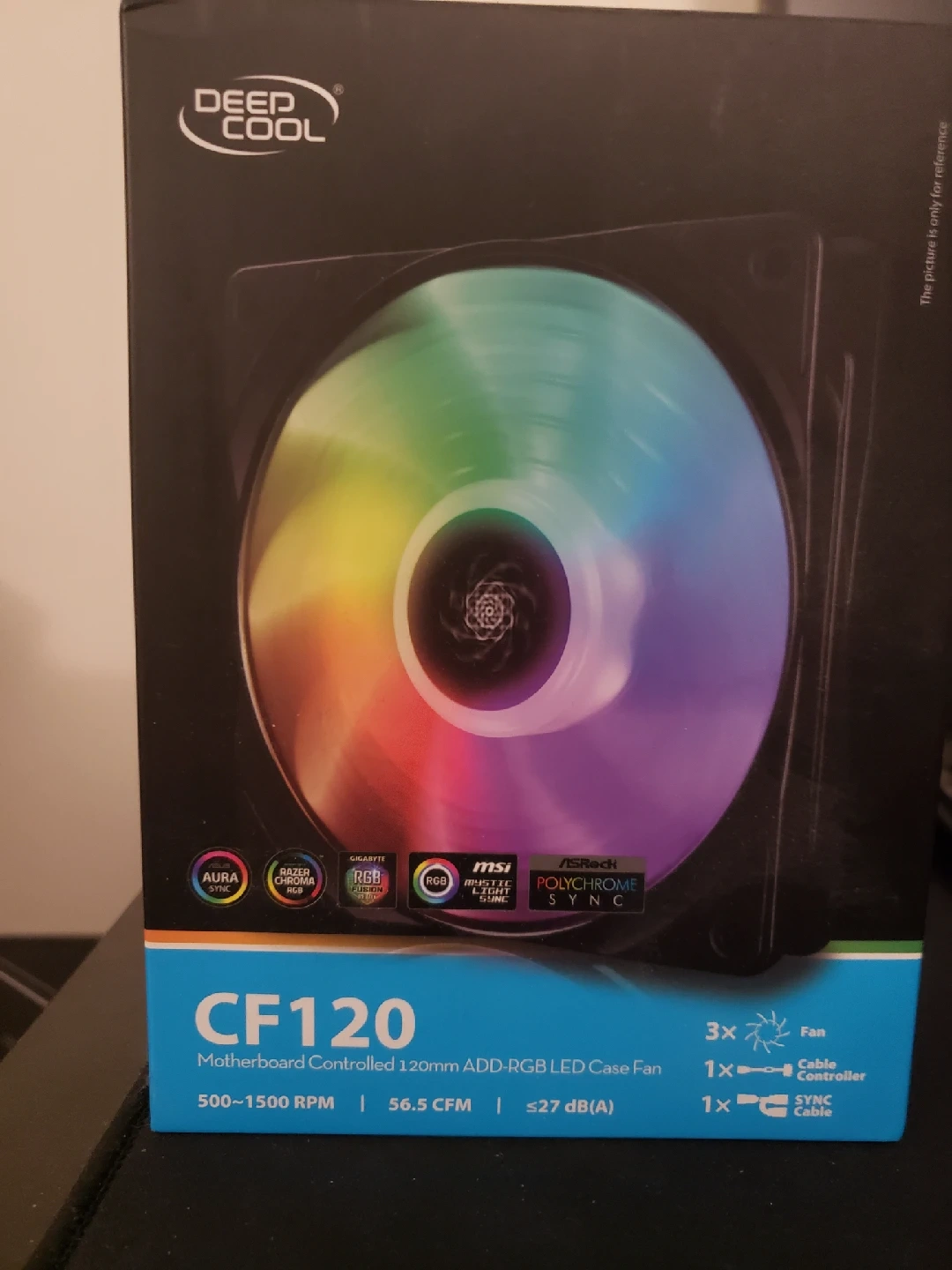 10Selling a DeepCool CF120 120mm 3in1 RGB LED Case Fan. Key features: - 12 RGB LEDs - Supports 5V RGB motherboard SYNC control - Built-in RGB cable controller - Fan dimensions: 120x120x25mm - Fan speed: 500-1500 RPM - Rated voltage: 12VDC - Hydro bearing Comes with the original box and all included components!