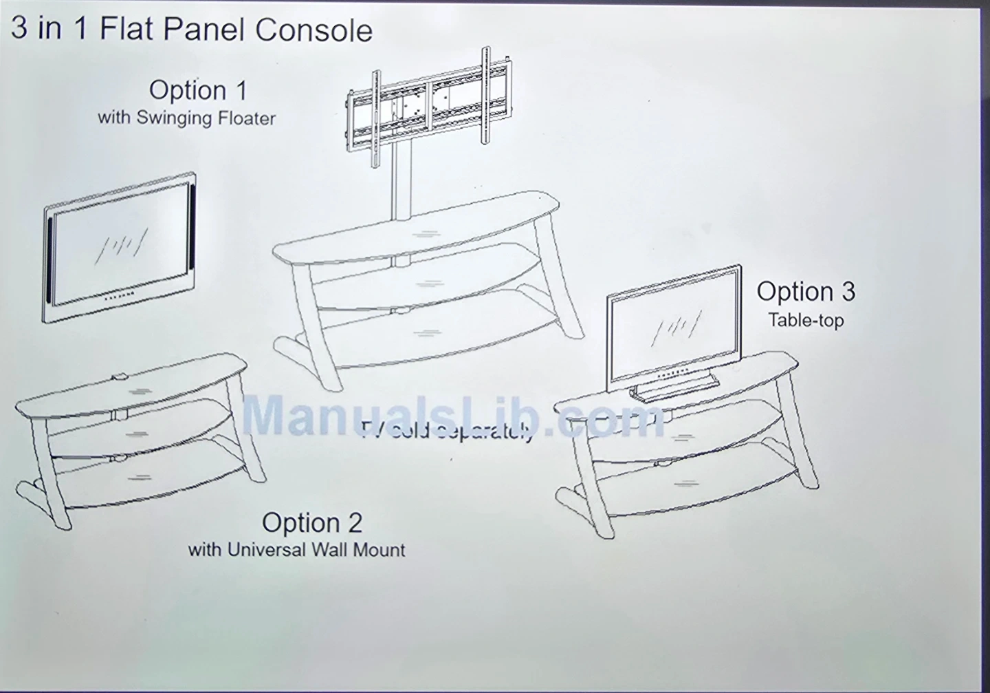10This is a 3 in 1 Flat Panel Console that offers multiple setup options: with a swinging floater (Option 1), with a universal wall mount (Option 2), or as a table-top (Option 3)