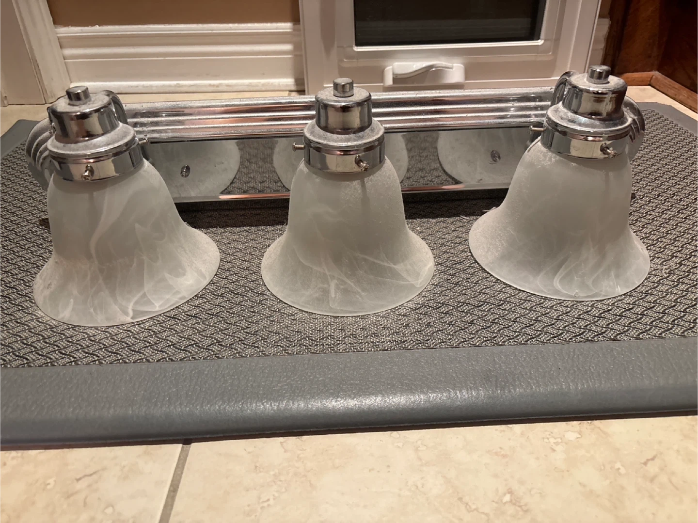 39Selling a 3-light vanity fixture! It features a chrome finish and bell-shaped white marbled glass shades. Perfect for adding a touch of elegance to your bathroom or powder room