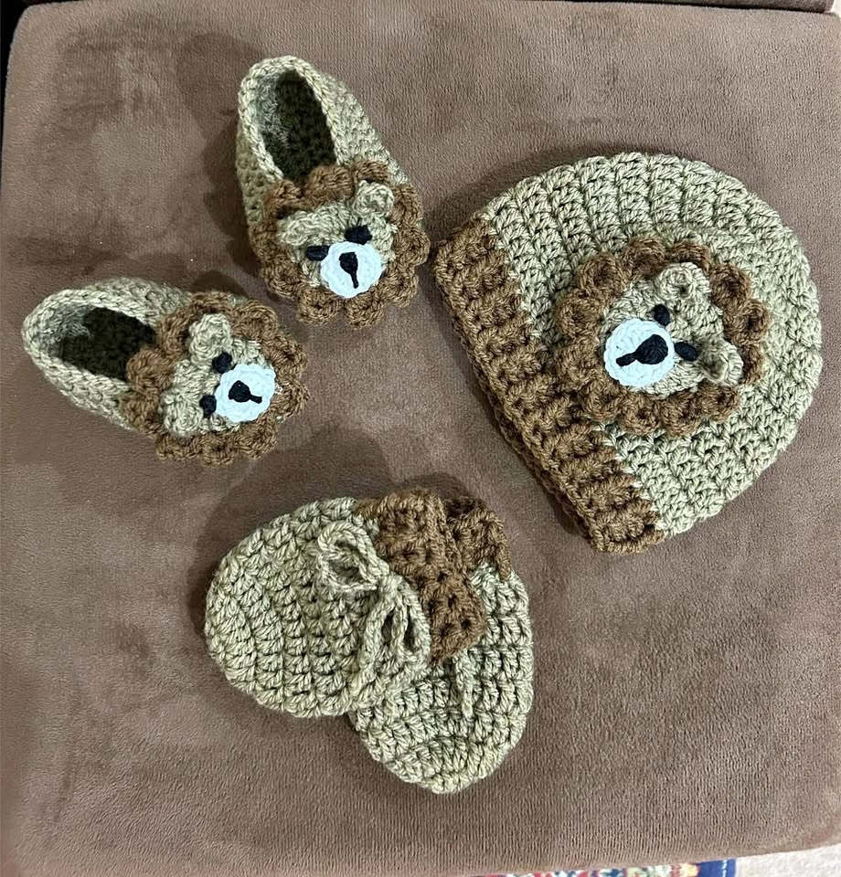 Lion baby gift set includes, booties, cap and mittens. Perfect as a baby shower present. Handmade and crocheted with love. Made from soft breathable acrylic yarn.