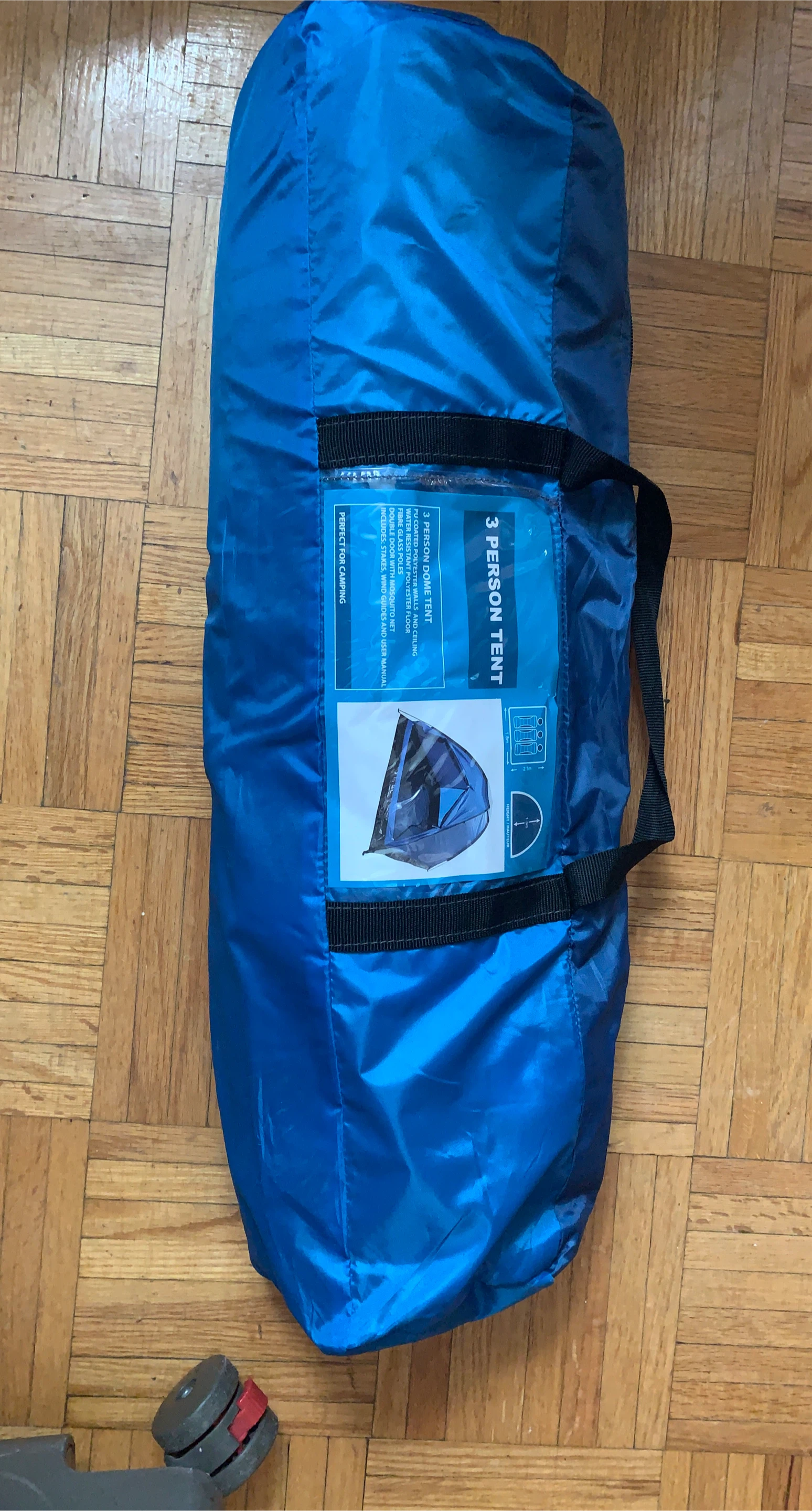 Selling a 3 person dome tent, perfect for camping! It features PU coated polyester walls and ceiling with a water resistant polyester floor. The tent has fibre glass poles and a double door with mosquito net. It includes stakes, wind guides, and a user manual