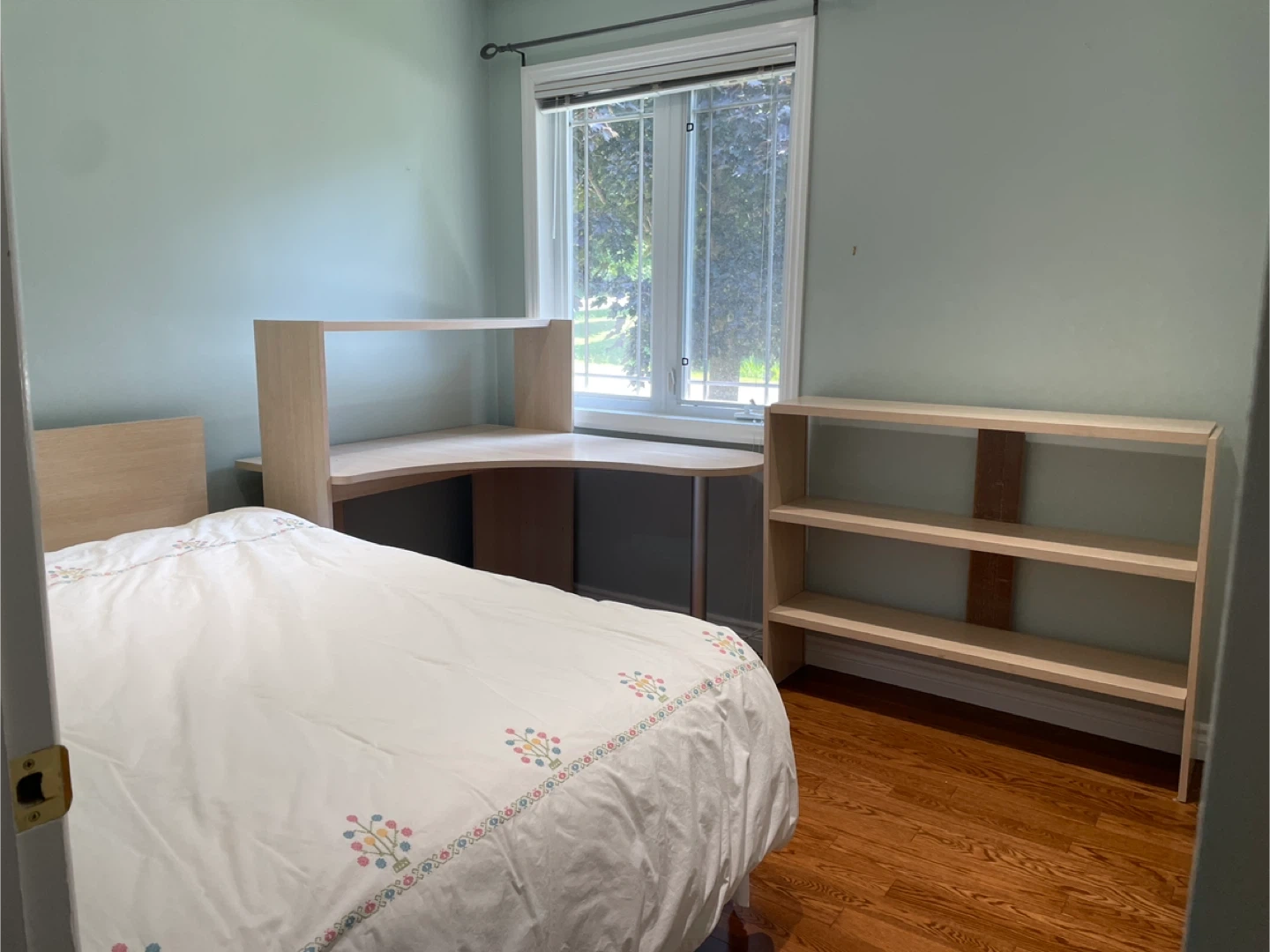 Selling a light wood desk with an attached shelf and a matching bookcase. They're in great condition and would be perfect for a student or home office setup! The desk has a unique curved design, and the bookcase offers ample storage space.
