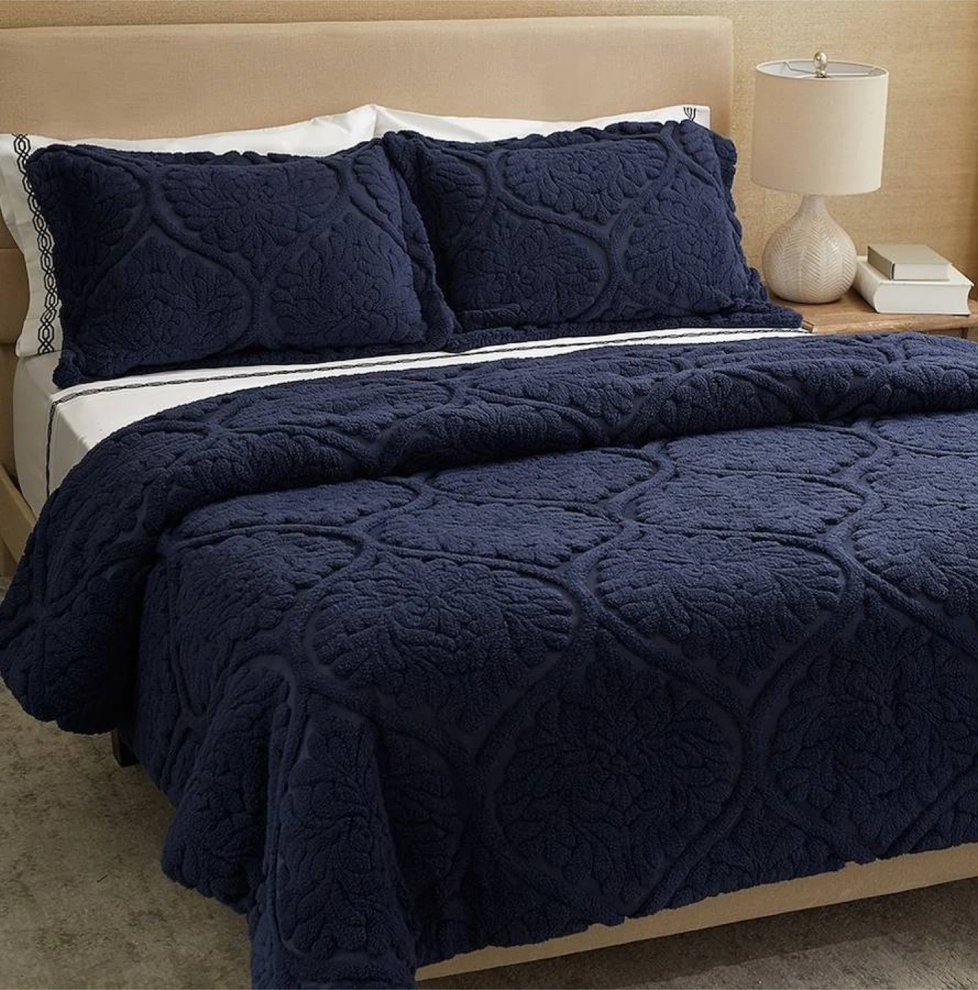21Guillaume Home Sherpa Jacquard 3-Piece Comforter Set double / queen size in Navy blue color - 2 shams + 1 comforter double sided design offers 2 different looks Excellent like new condition - only used for a few weeks when I had a visitor in my guest bedroom 100% polyester machine washable tumble dry comes in original clear plastic zip bag Pet and smoke free home
