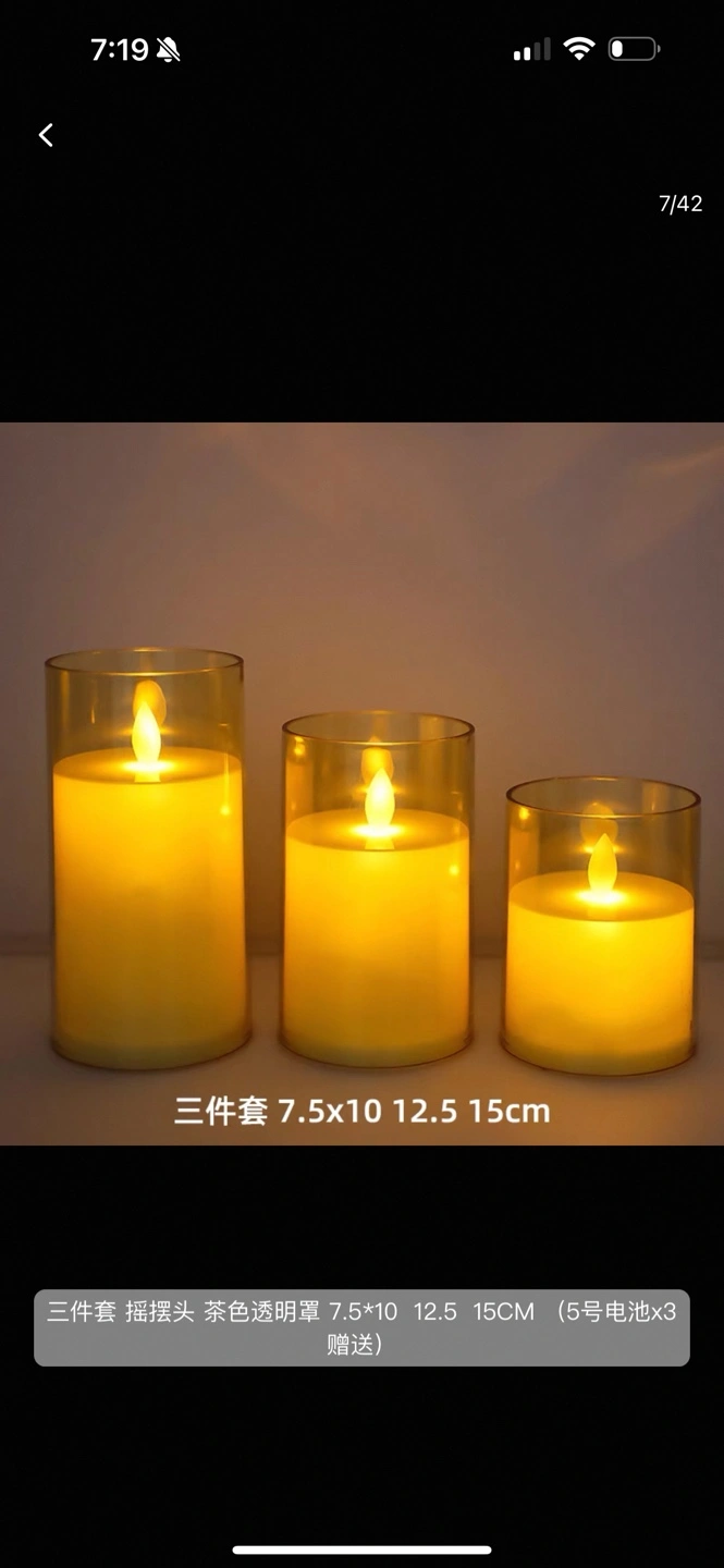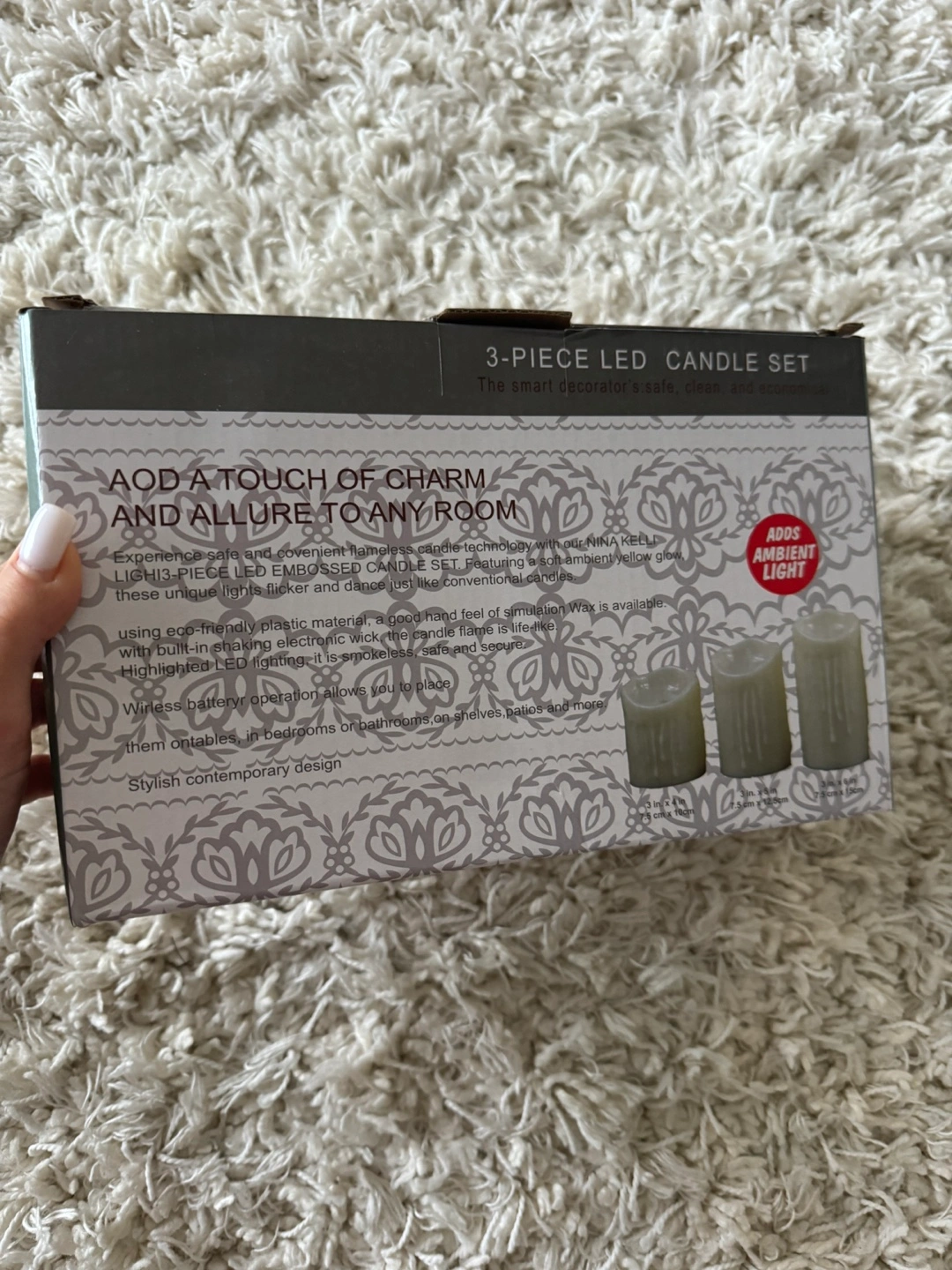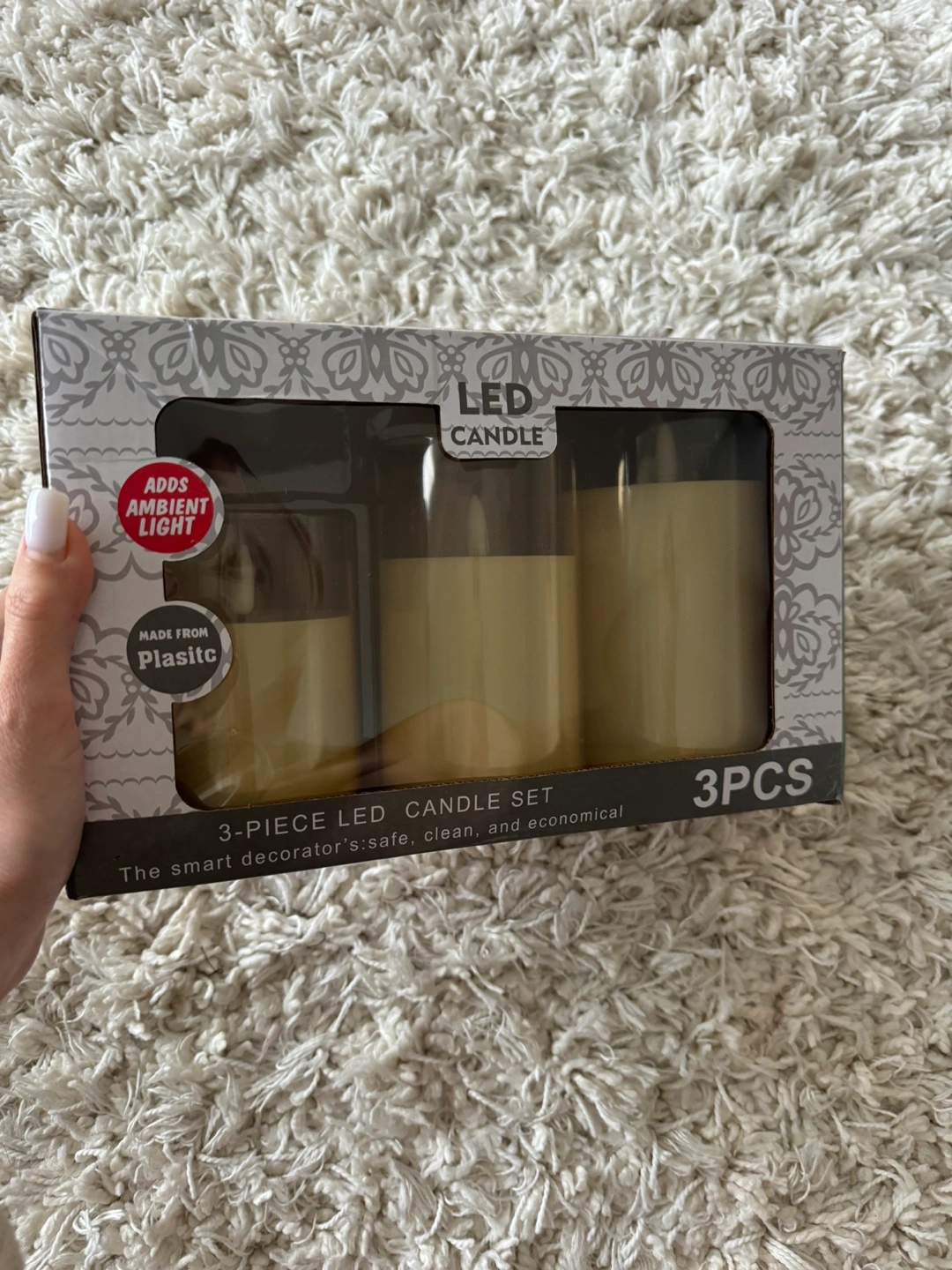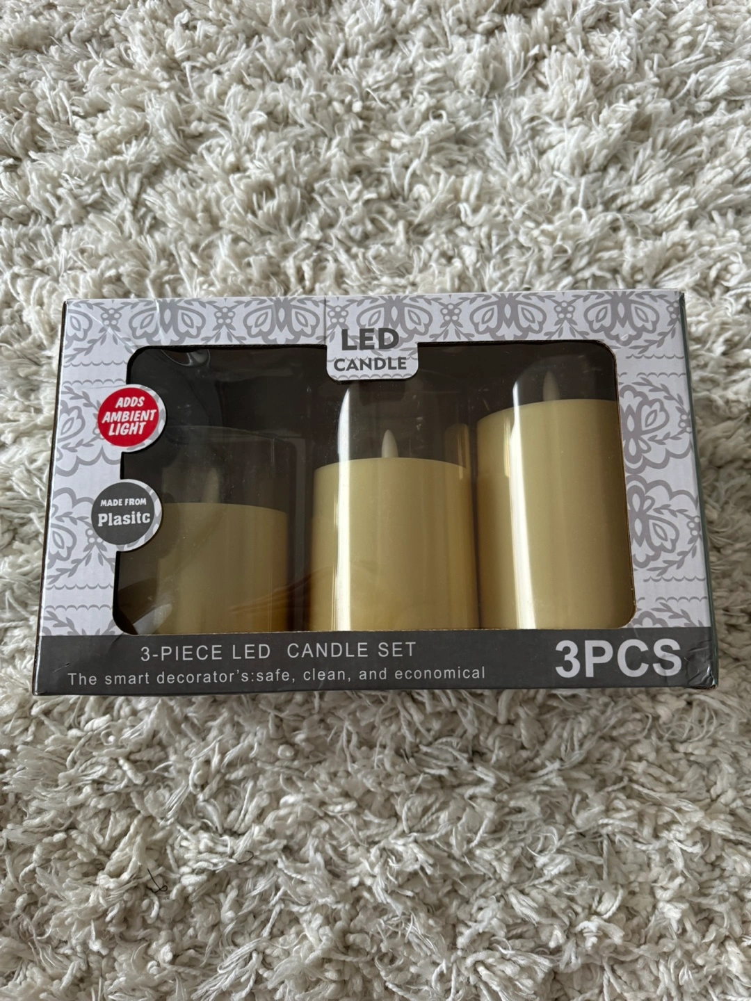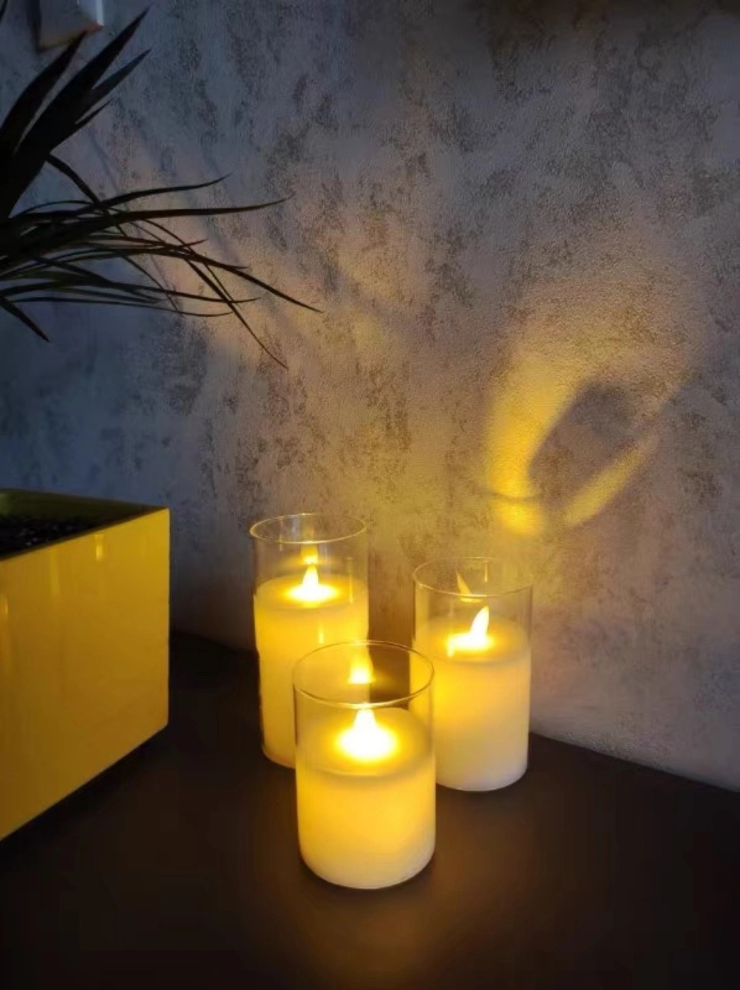 Three LED candles in glass holders. Adds ambient light. Safe, clean, and economical. Perfect for home decor. Battery-operated.