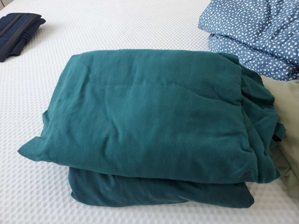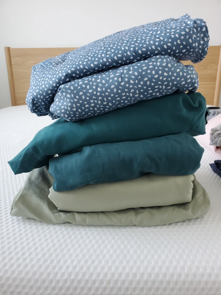 Selling 3 sets of bedsheets for a queen bed. Includes a fitted sheet and flat sheet. The set is in good condition and comes in 3 different colors and a pink fitted sheet.