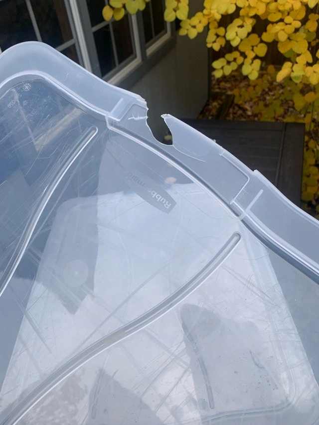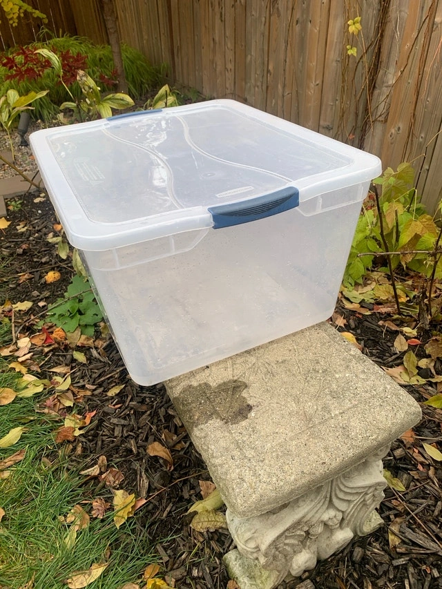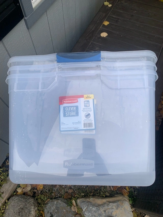 80Price is for 3 used Rubbermaid Clever Store 67.1L clear containers, perfect for maximizing your storage space with their straight wall design! Ideal for organizing your home, garage, or office. One of the containers has a lid, one has a cracked lid as shown and the other does not have a lid. They are in good condition and ready to help you declutter! * **Capacity: 67.1 L * **Dimensions:** 23.75 x 18.75 x 14.75 inches * **Material:** Durable plastic * **Latch Type:** Soft easy- If the ad is up, the container is available.