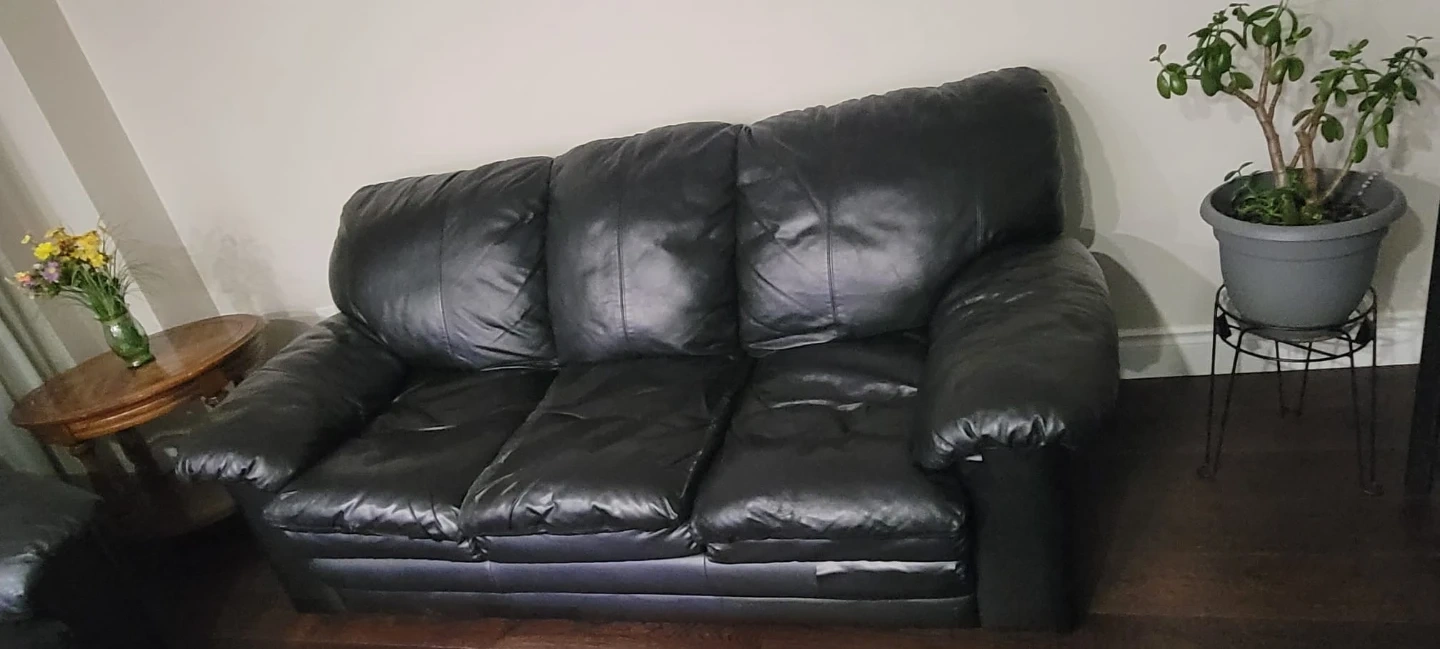 37Selling a 3 seat comfortable black genuine leather sofa. It's in used condition and would be a great addition to any living room or den. It has a classic look and is ready for a new home! It has some minor scratches and some parts have been repaired with leather repair tape. But otherwise, still have life in it and functions well FASTEST PICK UP FINCH AVE AND HWY 27 - Smoke free/Pet free home MOVING SALE - MUST BE PICKED UP BETWEEN NOV 10-14 SERIOUS BUYER ONLY - PLEASE DM WITH DATE AND TIME OF PICK UP
