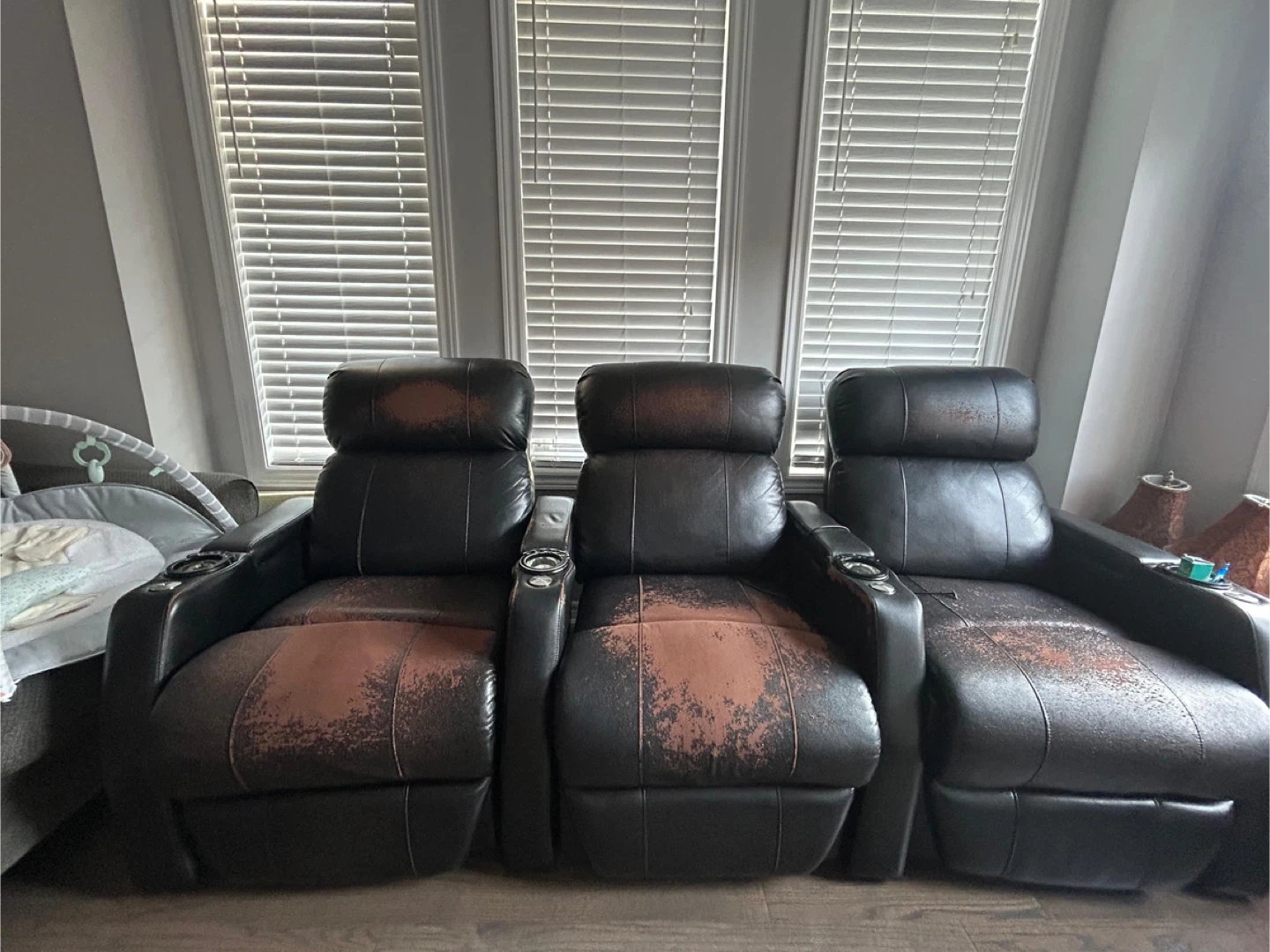 10Moving out Sale: Works perfectly fine except the leather has come off a little which can be fixed…hence i am selling it cheap!! Selling a 3-seat power reclining sofa, perfect for a home theatre or living room. It features a sleek black leather finish and convenient cup holders on each seat. The recliners are in used condition, as pictured.