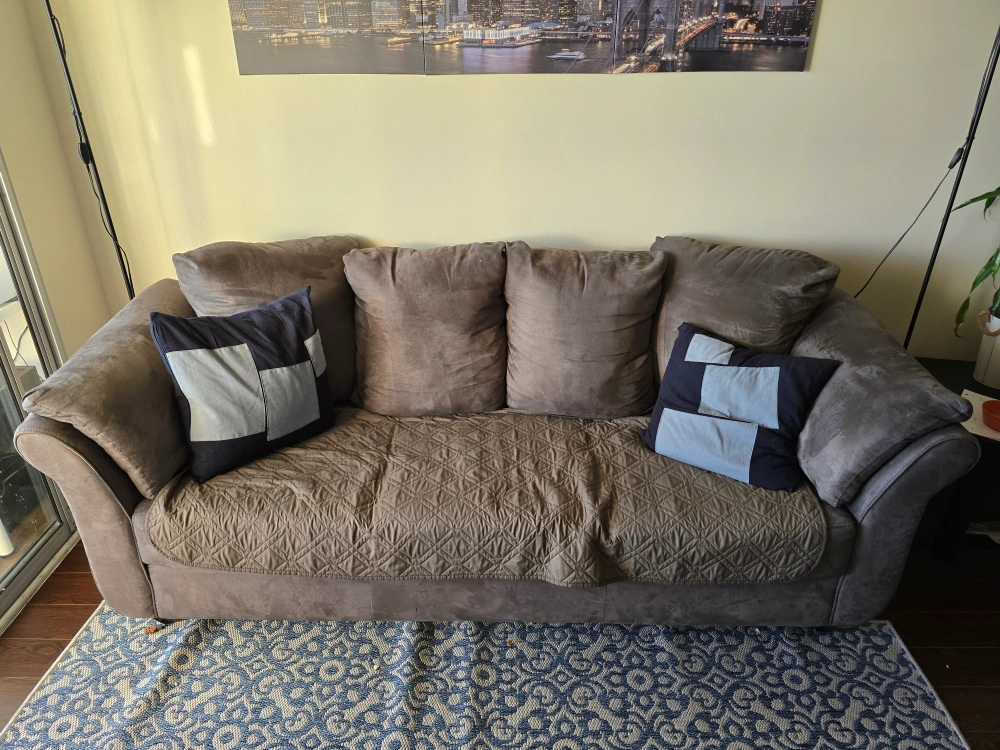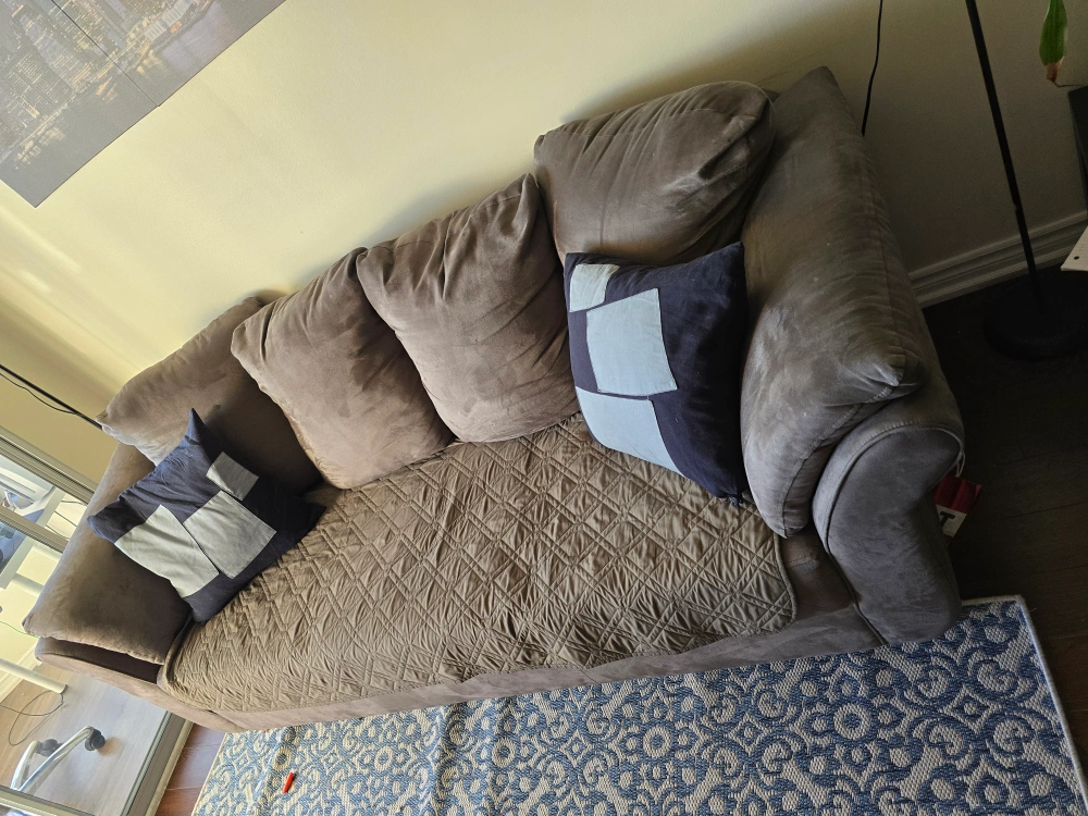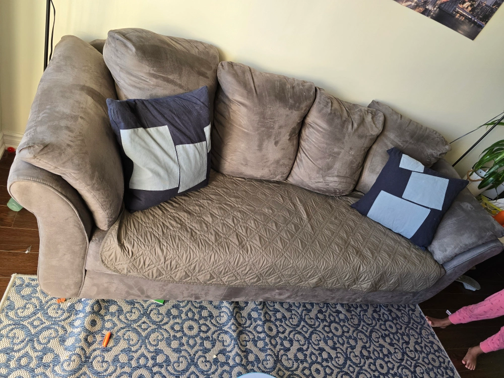 3 seater comfortable leons sofa. used in good condition. pickup at 115 Hillcrest avenue . pillows not included. looking to disperse quickly as new sofa arriving and need to free up space