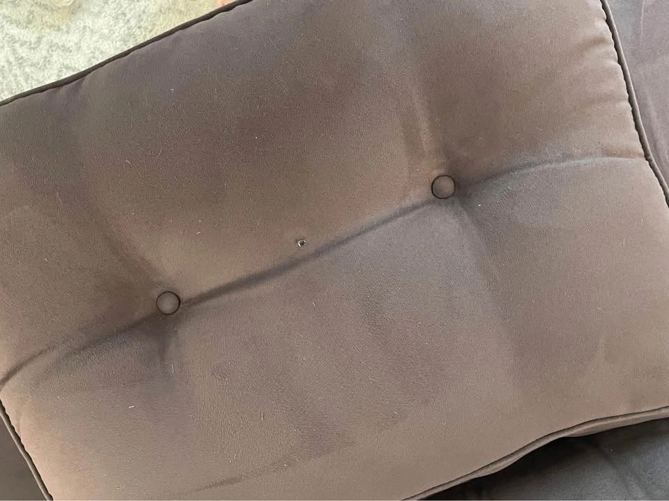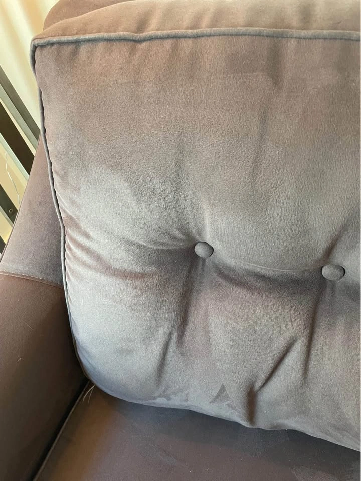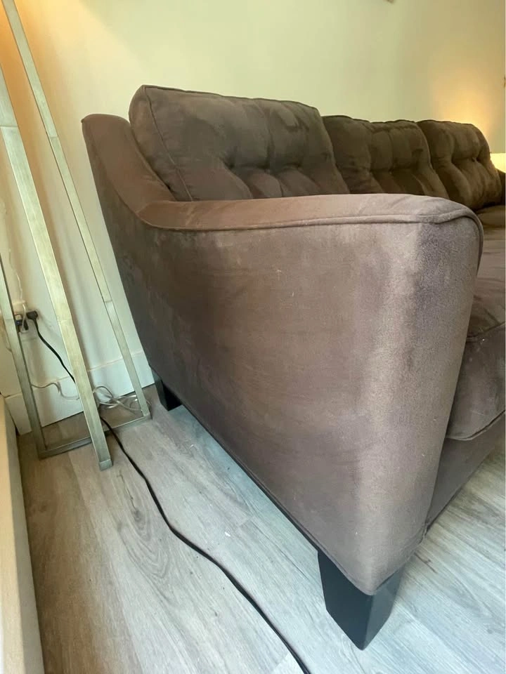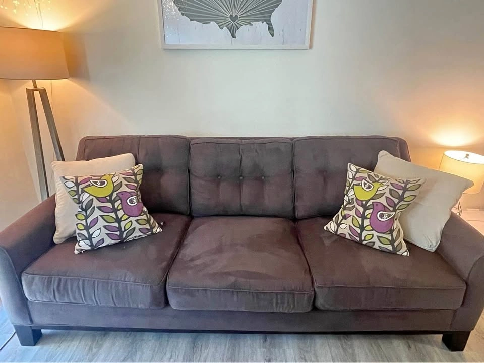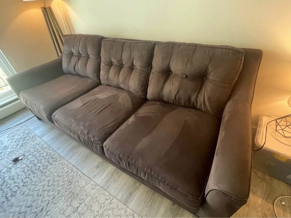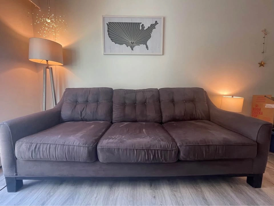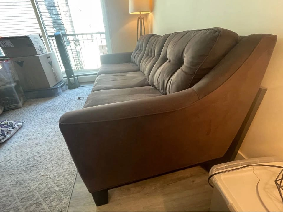 89Comfortable and stylish 3-seater sofa in a neutral slate grey-brown tone. Tufted back cushions, plush seating, and modern low-profile arms make it easy to style in any space. Recently “brushed”. Dimensions: 84” W x 35” D x 33” H Removable cushions for easy cleaning Good condition overall One missing button on a back cushion (not visible if cushion is flipped) Perfect for apartments, condos, or living rooms — blends seamlessly with warm or cool decor tones. Moving and getting a new one that fits my new decor better! Pickup only (E 14th & Prince Edward / Mount Pleasant)