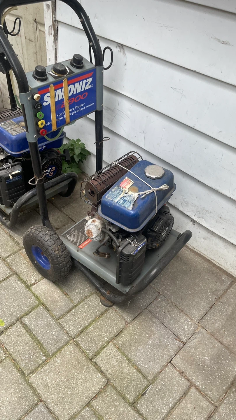 10Selling a Simoniz gas pressure washer. It's a 3200 model, perfect for outdoor cleaning. It has a 6.5 HP engine. Great for washing your car, driveway, or deck!