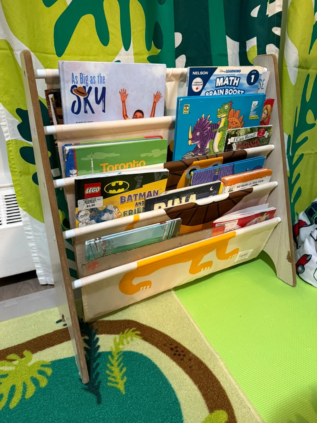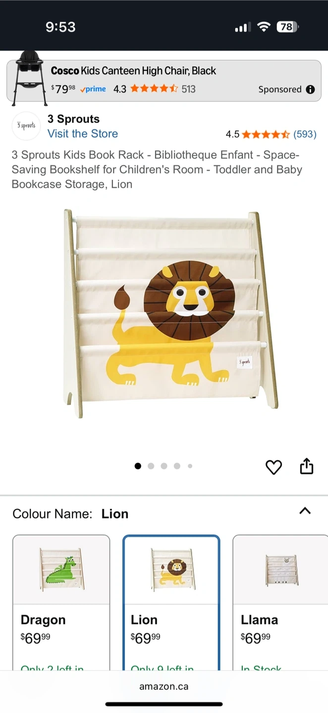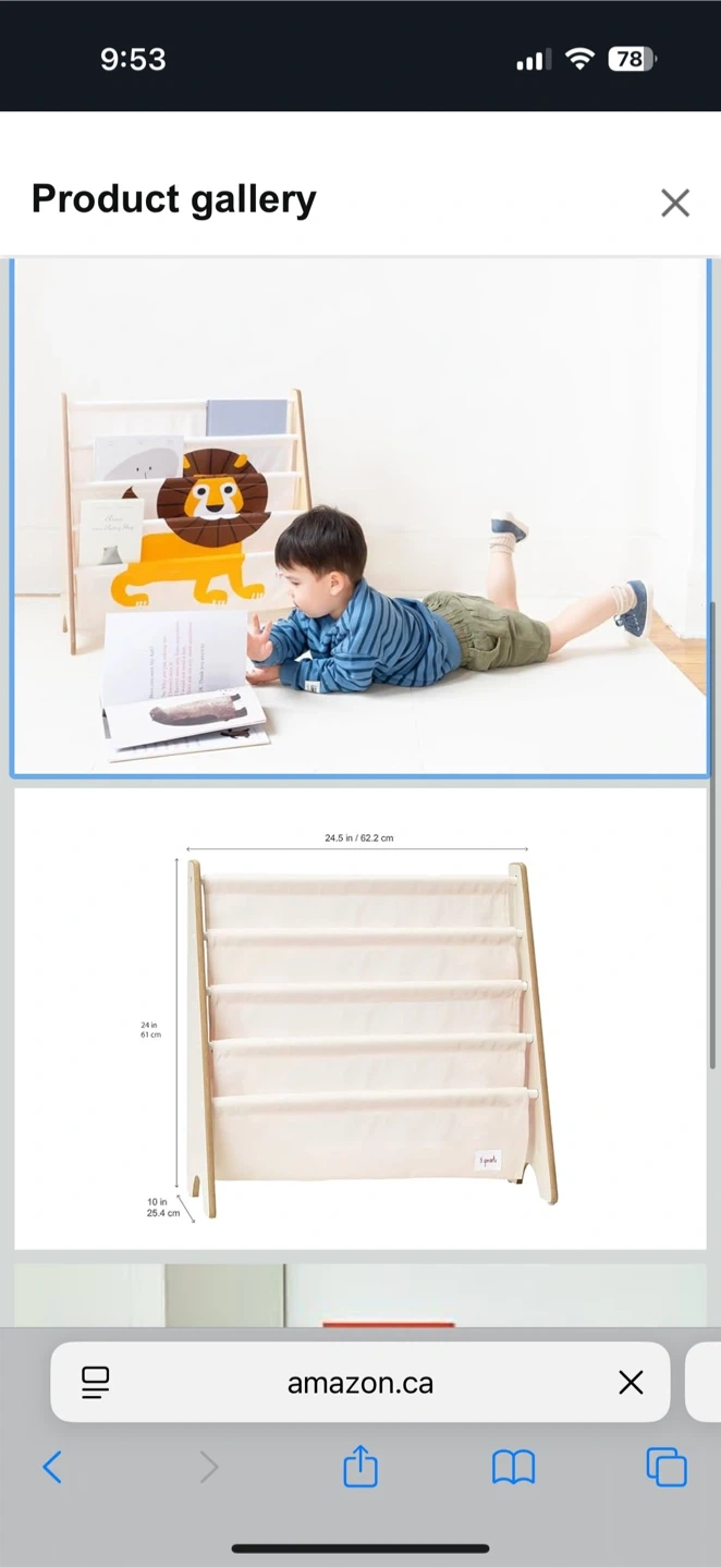 This is a 3 Sprouts kids book rack with a cute lion design! It's perfect for a children's room, toddler, or baby bookcase storage. The dimensions are 24.5 in / 62.2 cm wide, 24 in / 61 cm high, and 10 in / 25.4 cm deep