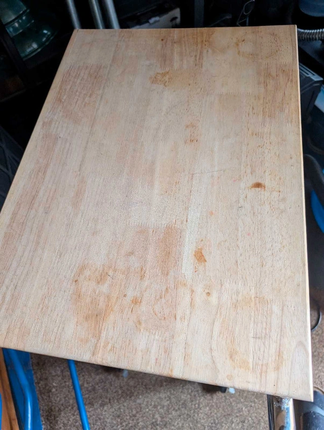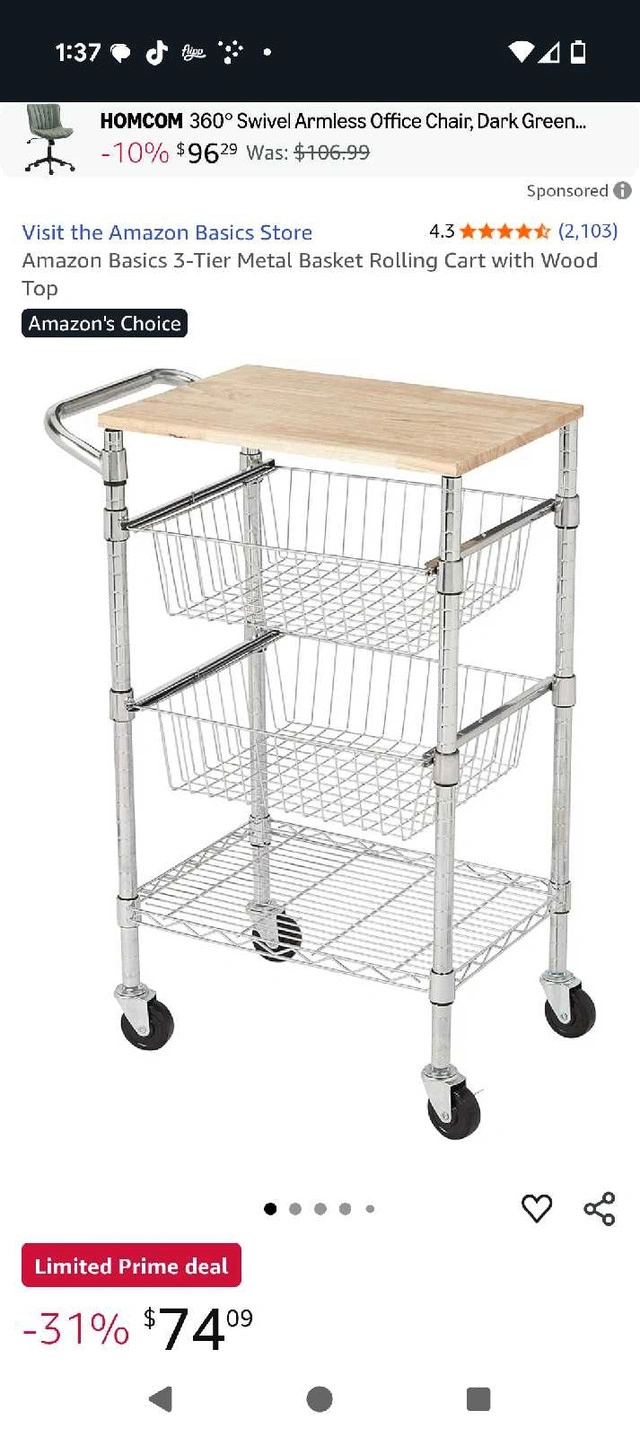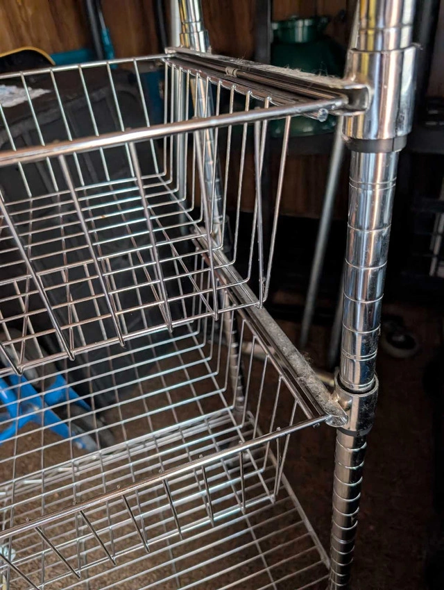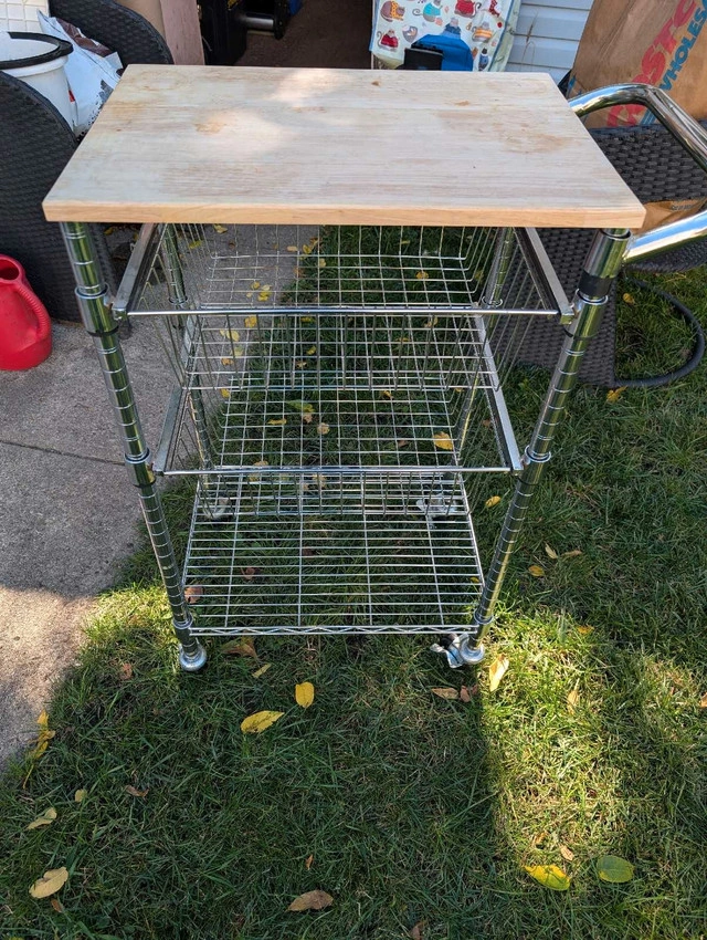 3 tier kitchen cart. Adjustable. Has breaks and wheels. Top is wood and was never used as a cutting board. It was used in my kitchen to set things on as needed and store utensils. The first photo is a stock photo of the cart. Lots of life left!