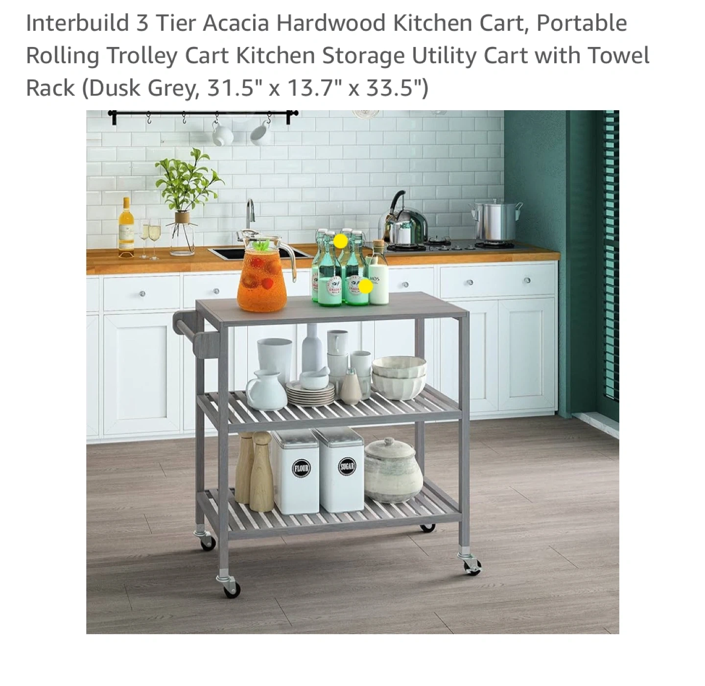 10Interbuild 3 Tier Acacia Hardwood Kitchen Cart, Portable Rolling Trolley Cart Kitchen Storage Utility Cart with Towel Rack (Dusk Grey, 31.5" x 13.7" × 33.5"') Great Bar cart !! Brand new in unopened box