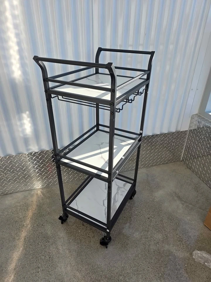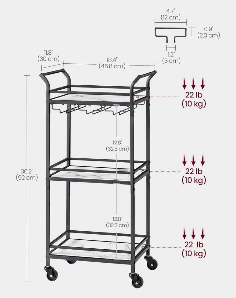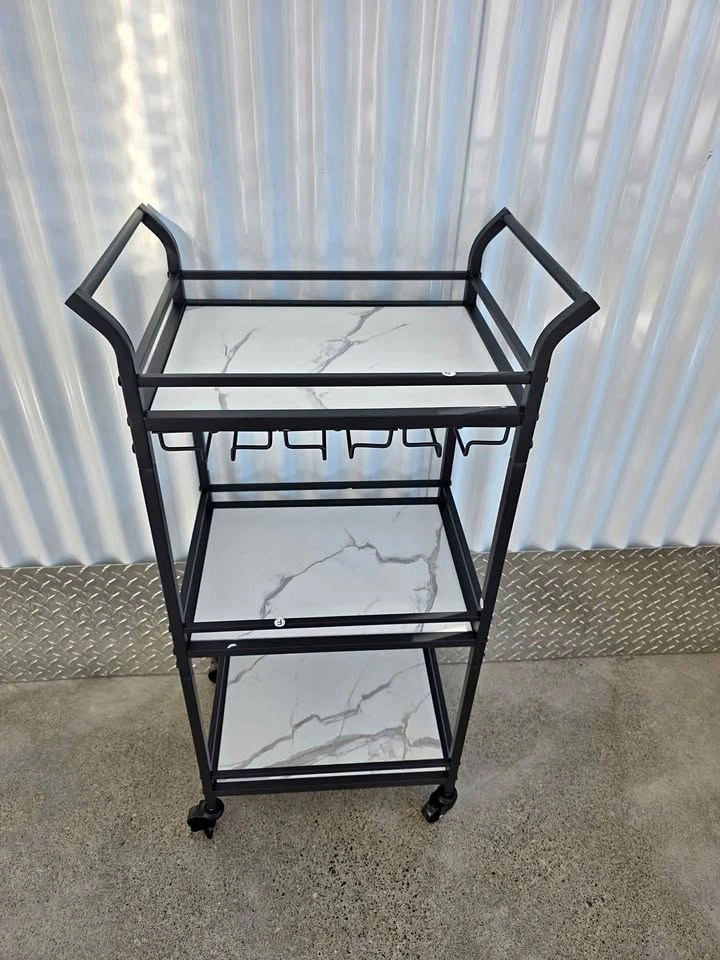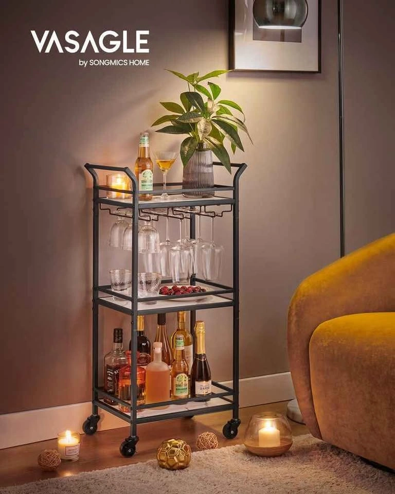 Sleek and functional, this VASAGLE Small Bar Cart is the perfect addition to any kitchen, dining room, or home bar setup. With three marble-style glass shelves and a removable wine glass rack, it combines modern design with practical storage. Dimensions: 11.8"D × 18.4"W × 36.2"H 3-Tier design for bottles, glasses, or décor Removable wine glass rack – fits multiple stemware types Smooth-rolling caster wheels for easy movement Sturdy steel frame with elegant marble-look shelves Curved ergonomic handles for easy mobility Load capacity: 22 lbs (10 kg) per shelf Ideal for entertaining, kitchen organization, or staging Condition: Brand new, pulled from a liquidation pallet