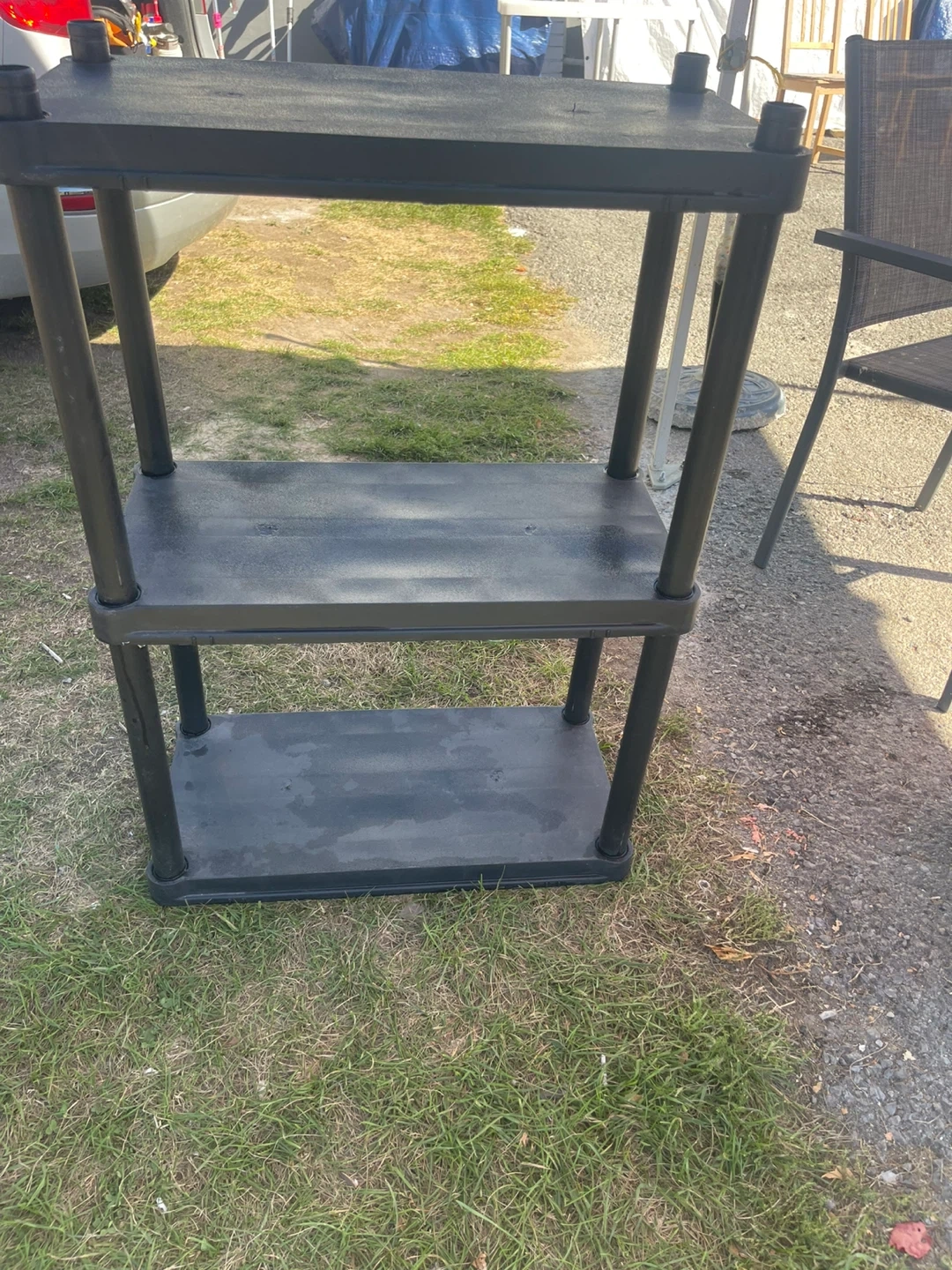 Selling a handy 3-tier shelf, perfect for organizing your space! It's made of durable black plastic and is easy to assemble. Great for use in a garage, closet, or even a small apartment. It's in good condition and ready for a new home