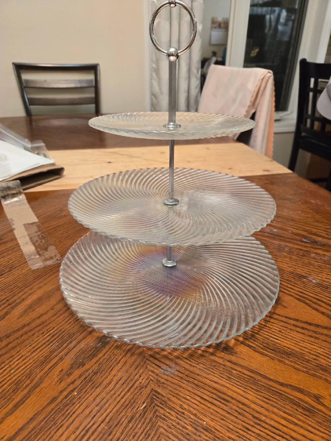 20Selling a lovely 3-tier glass dessert stand! It's perfect for displaying cupcakes, appetizers, or any treats for your next gathering. The stand has a beautiful, clear glass design with a silver-tone metal frame. It's in great condition and ready to add a touch of elegance to your table
