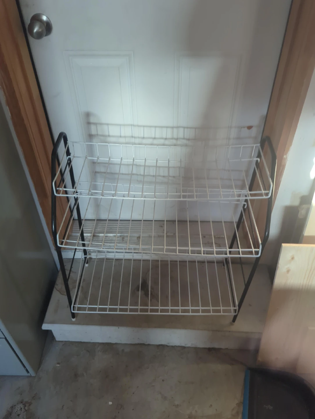 21Selling a handy 3-tier wire shoe rack! It's perfect for keeping your entryway or closet organized. The rack has a black frame with white wire shelves, providing a simple and functional storage solution for your shoes