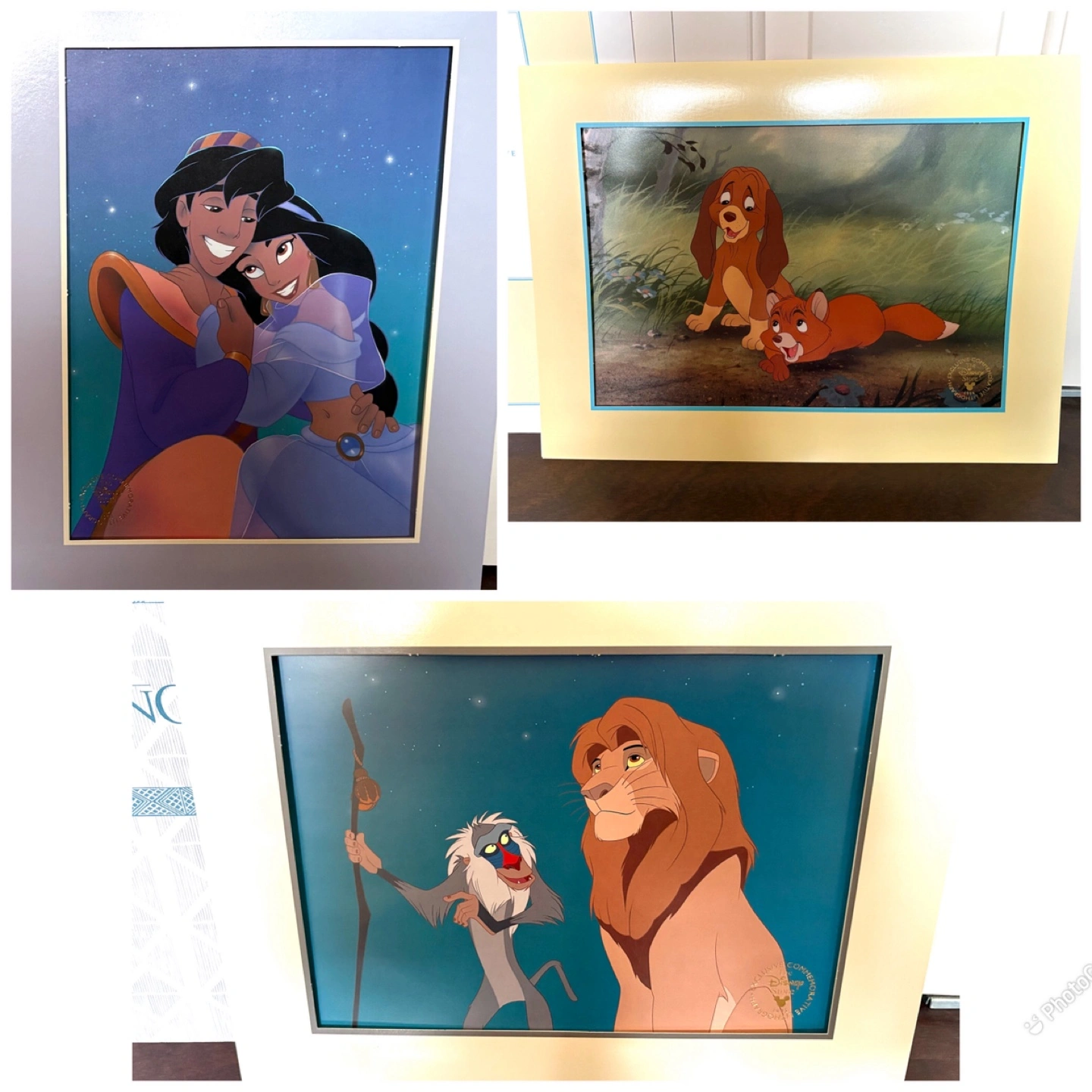 MINT CONDITION Selling a set of framed lithographs from the Disney Store! These are exclusive commemorative pieces. Included are: - Aladdin (1993) - The Fox and the Hound (1994) - The Lion King They're in great shape and ready to add some Disney magic to your space.