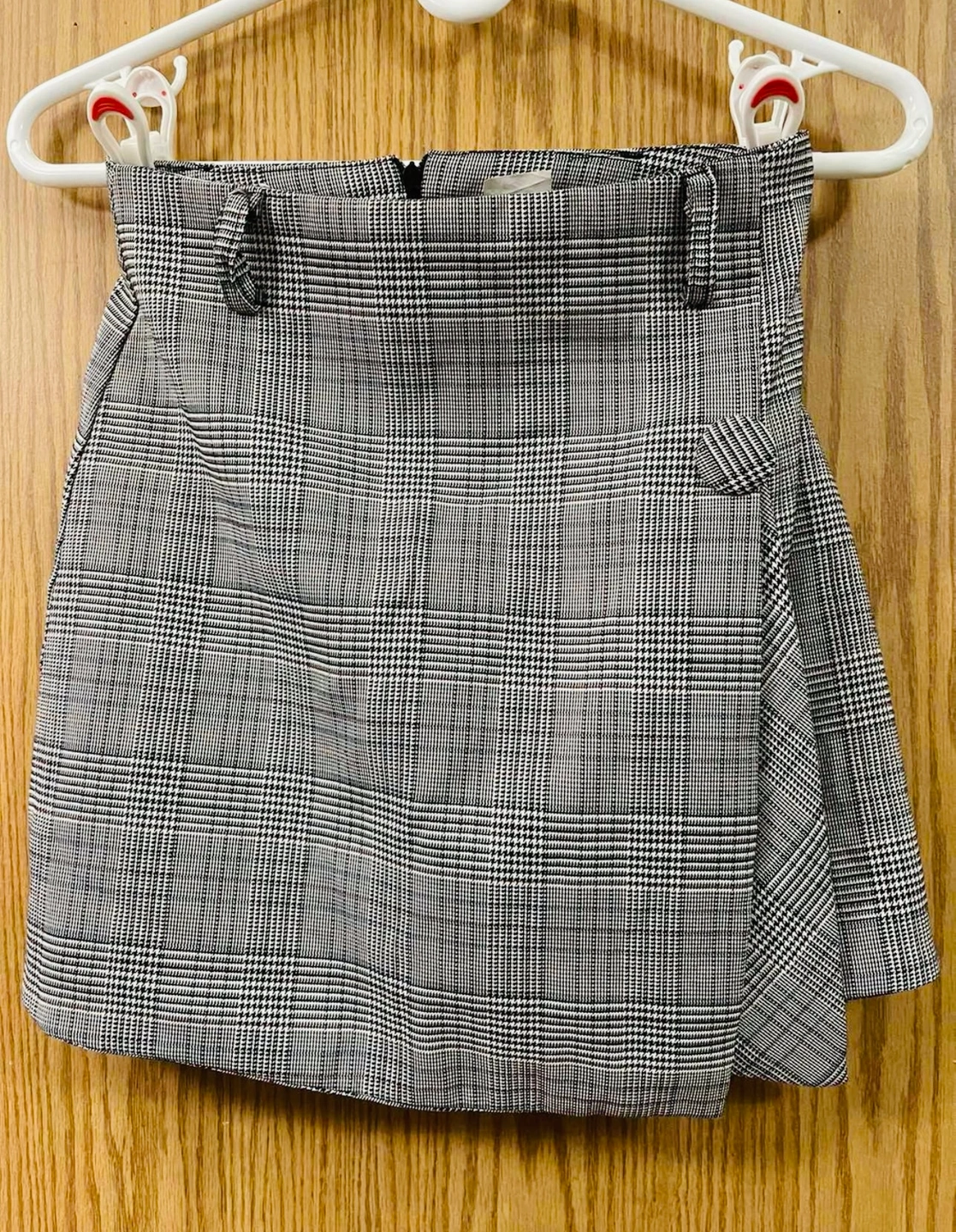 A white long-sleeved top and a black and white plaid skirt.