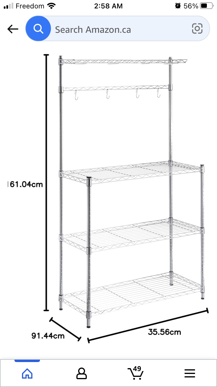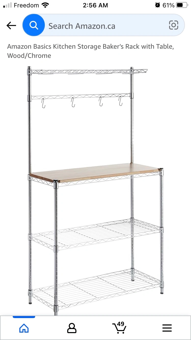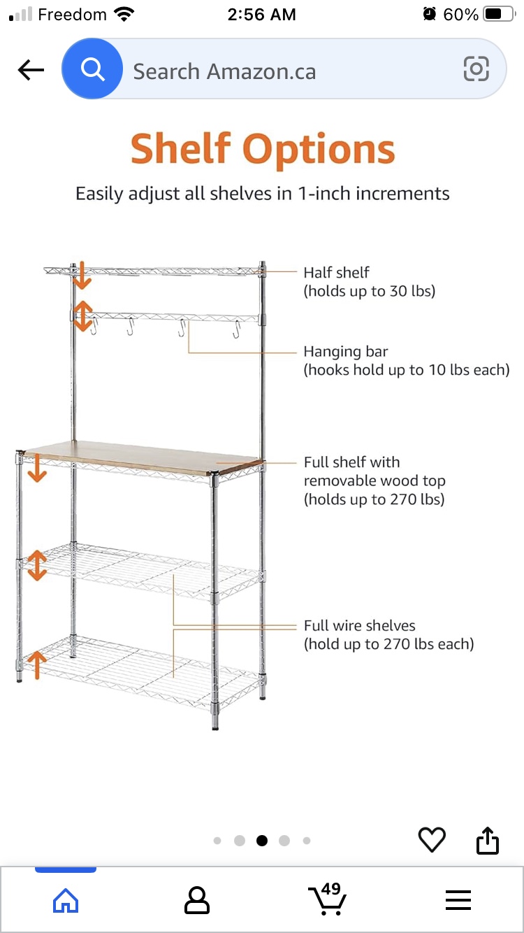 A chrome kitchen baker's rack with a wood countertop and three wire shelves. It also has a hanging bar for hanging utensils or towels. The shelves can be adjusted in 1-inch increments.