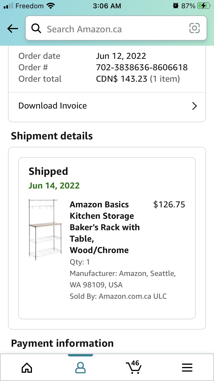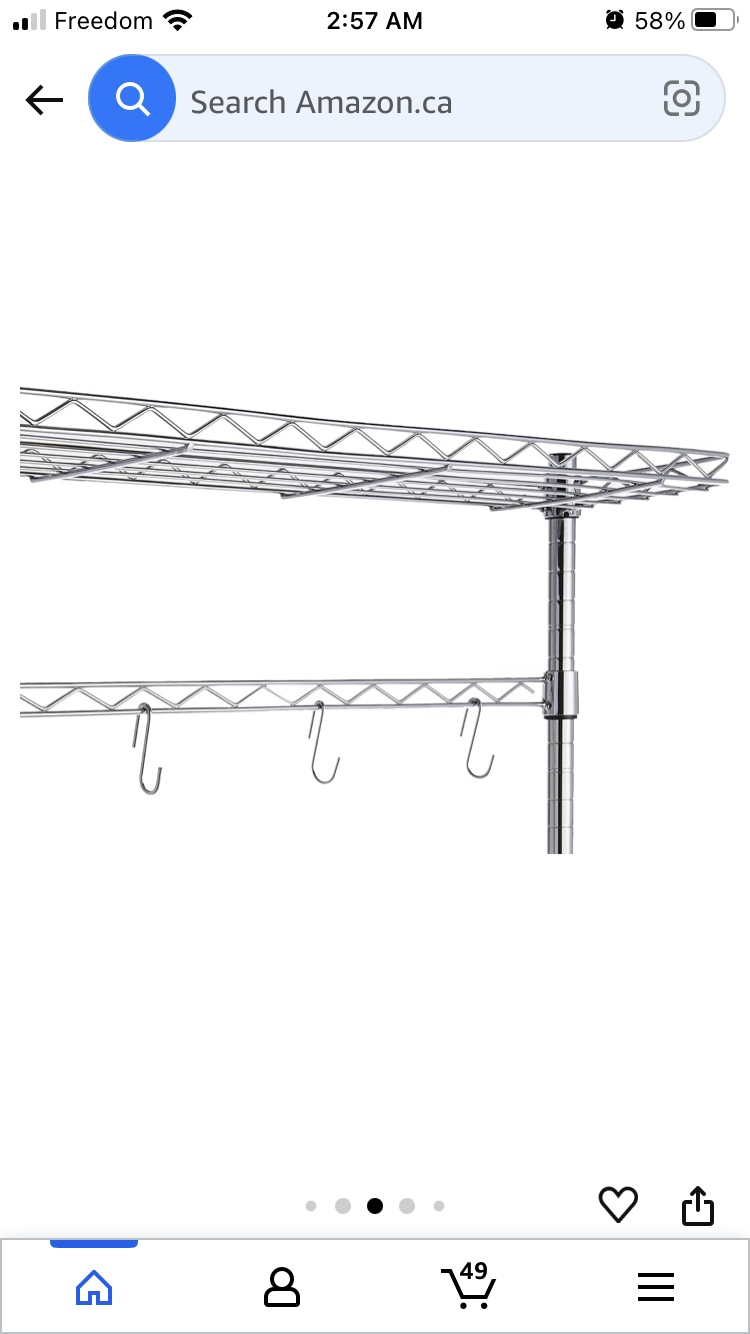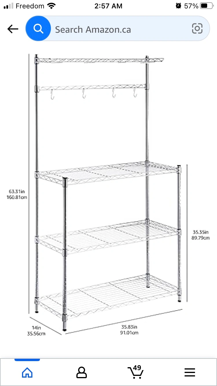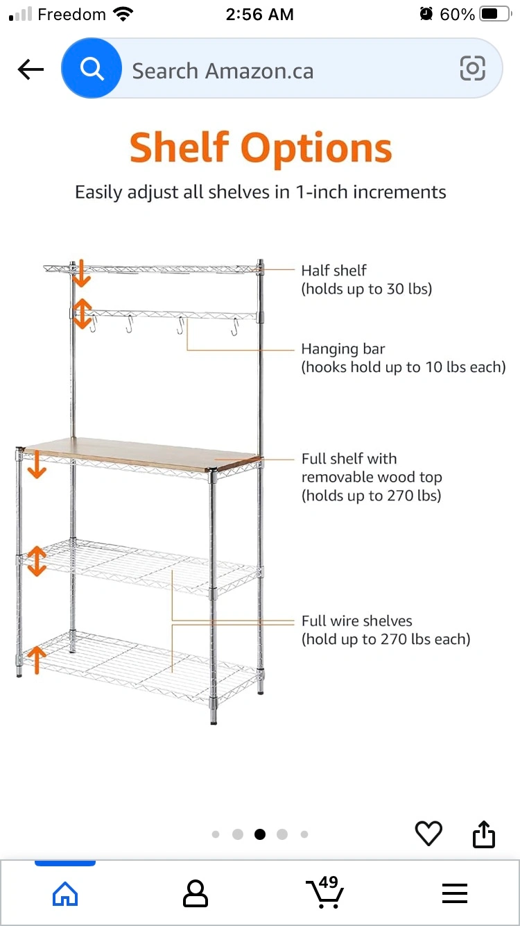A chrome kitchen baker's rack with a wood countertop and three wire shelves. It also has a hanging bar for hanging utensils or towels. The shelves can be adjusted in 1-inch increments.