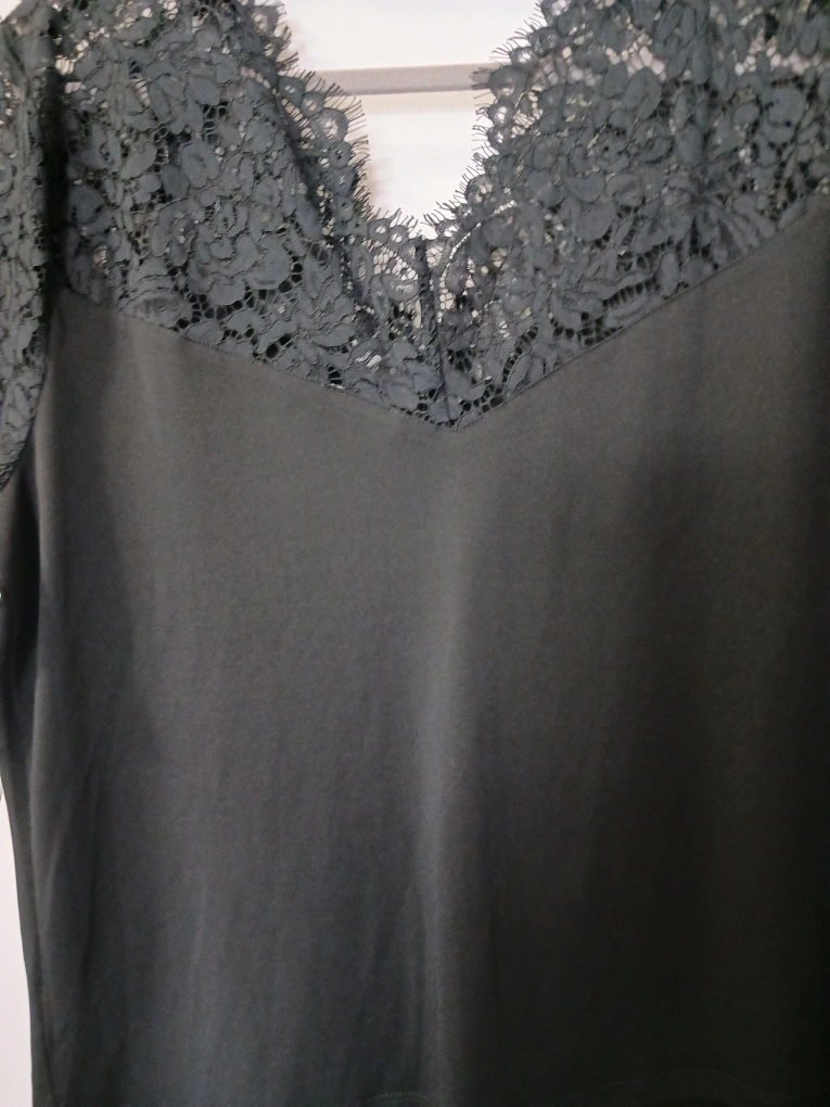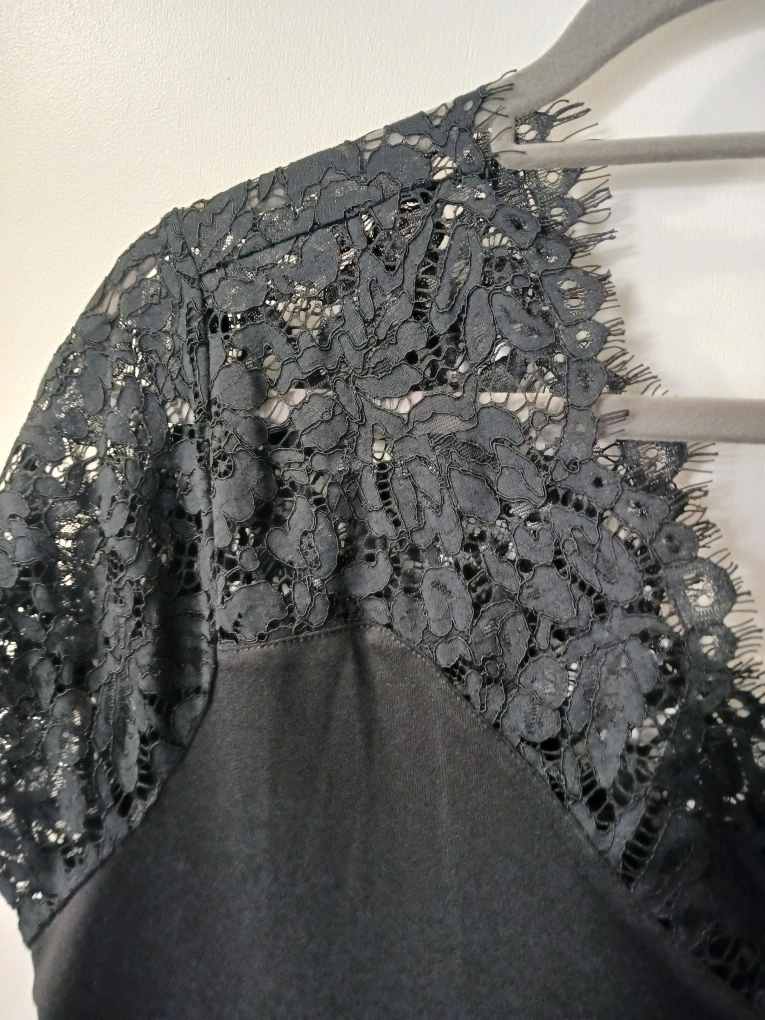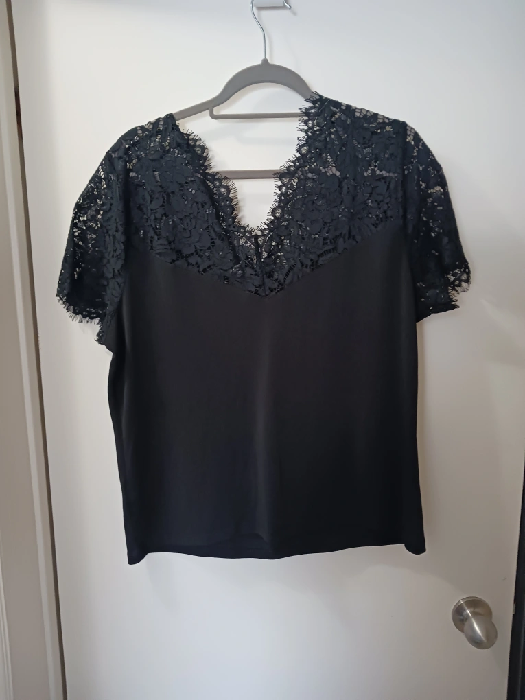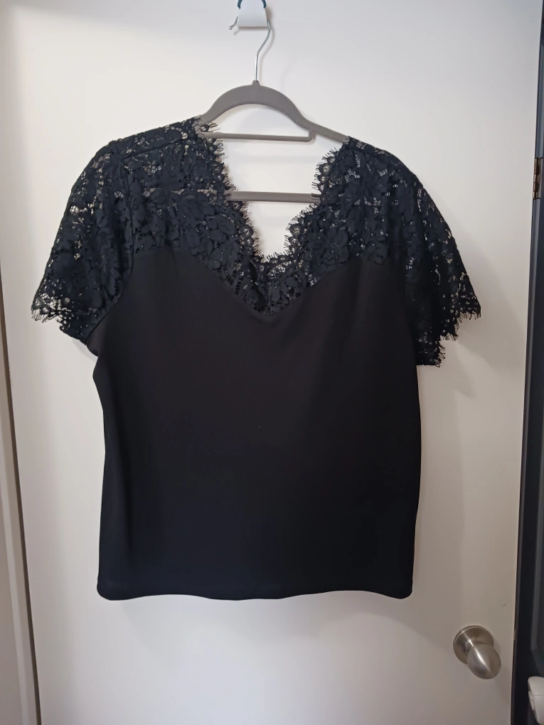 Black lace top with short sleeves and a V-neck. Size XL/LTG. Great for dressing up or down.