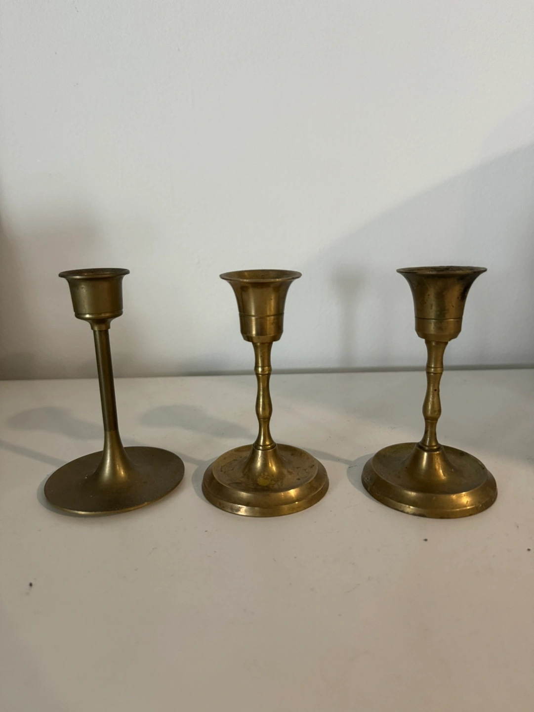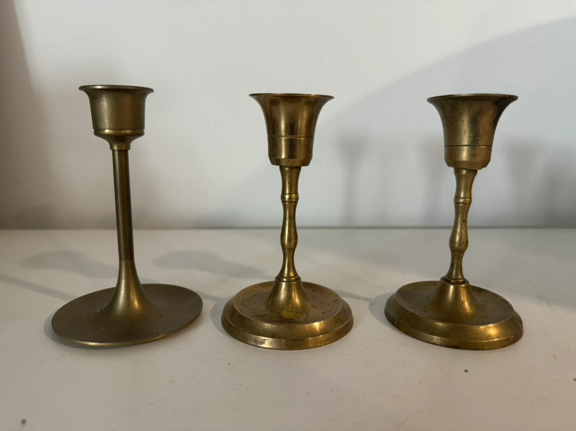 382A set of three brass candle holders of varying heights.