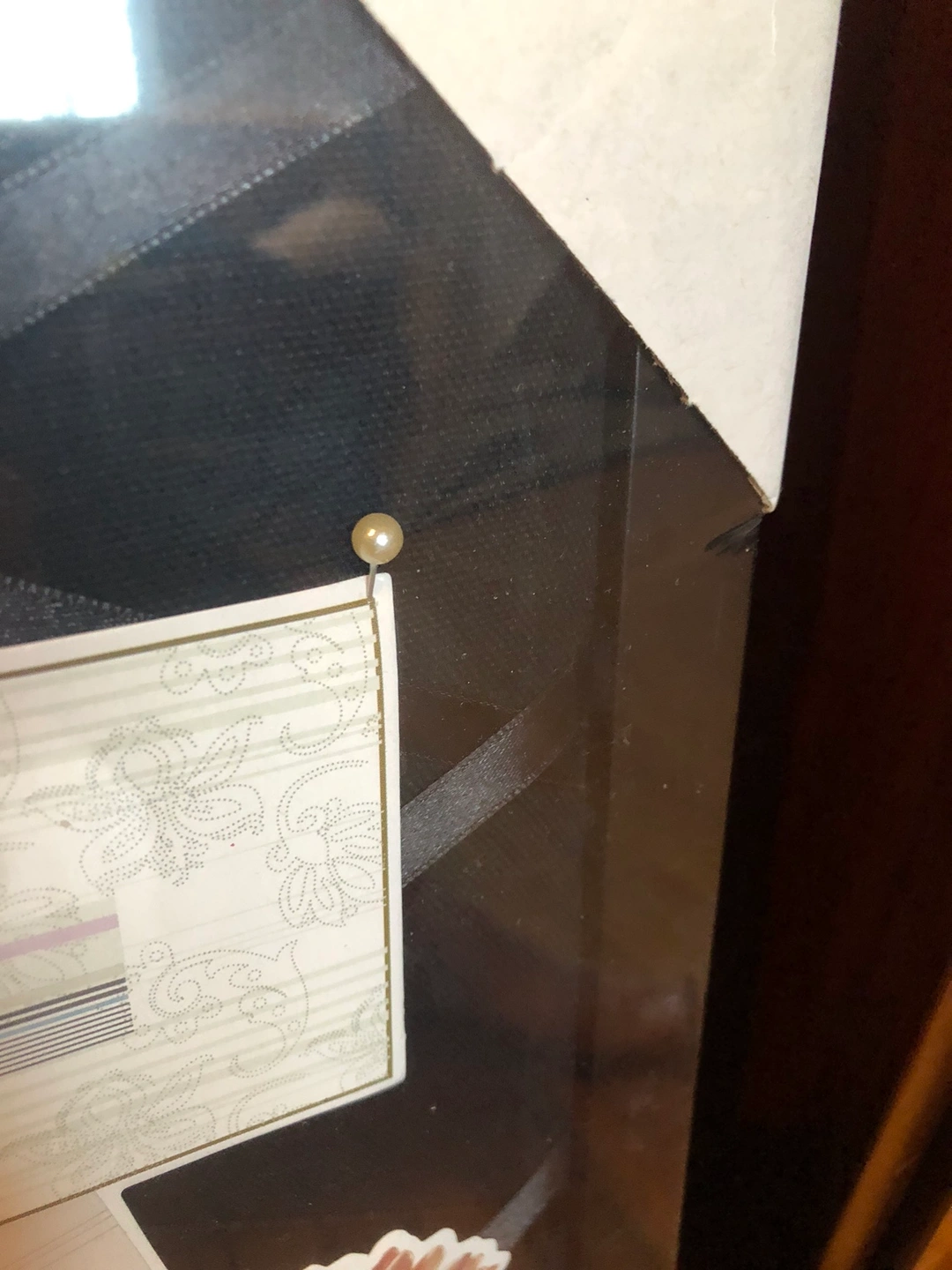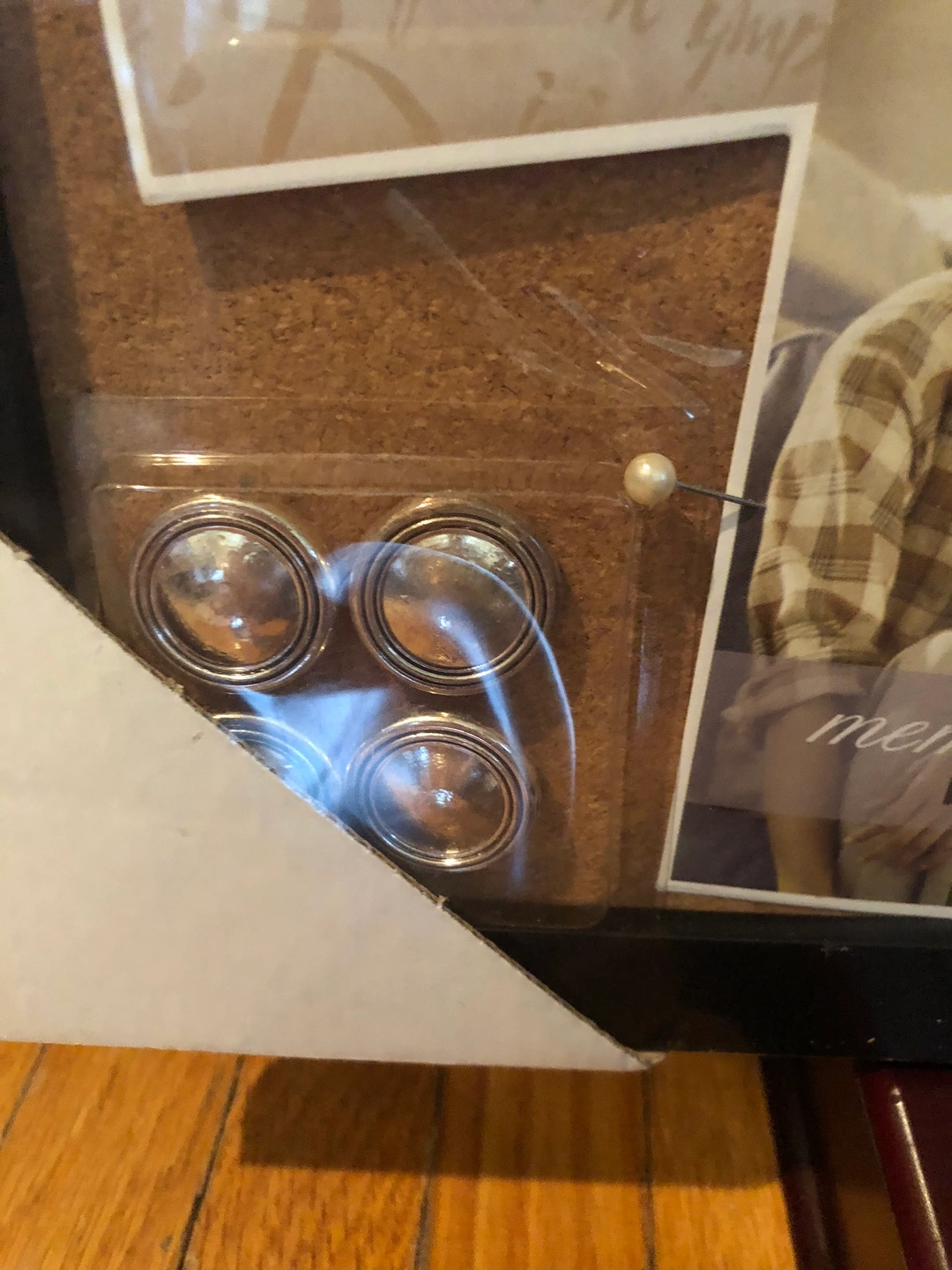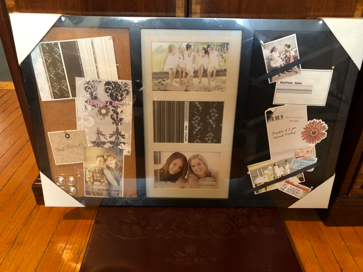 Very cute black picture frame/cork board combo. Faux pearl push pins, ribbon detail. Still in plastic. Plastic has some tears in it, but has never been opened or used. From pet free/smoke free home. Yonge/Davisville area.