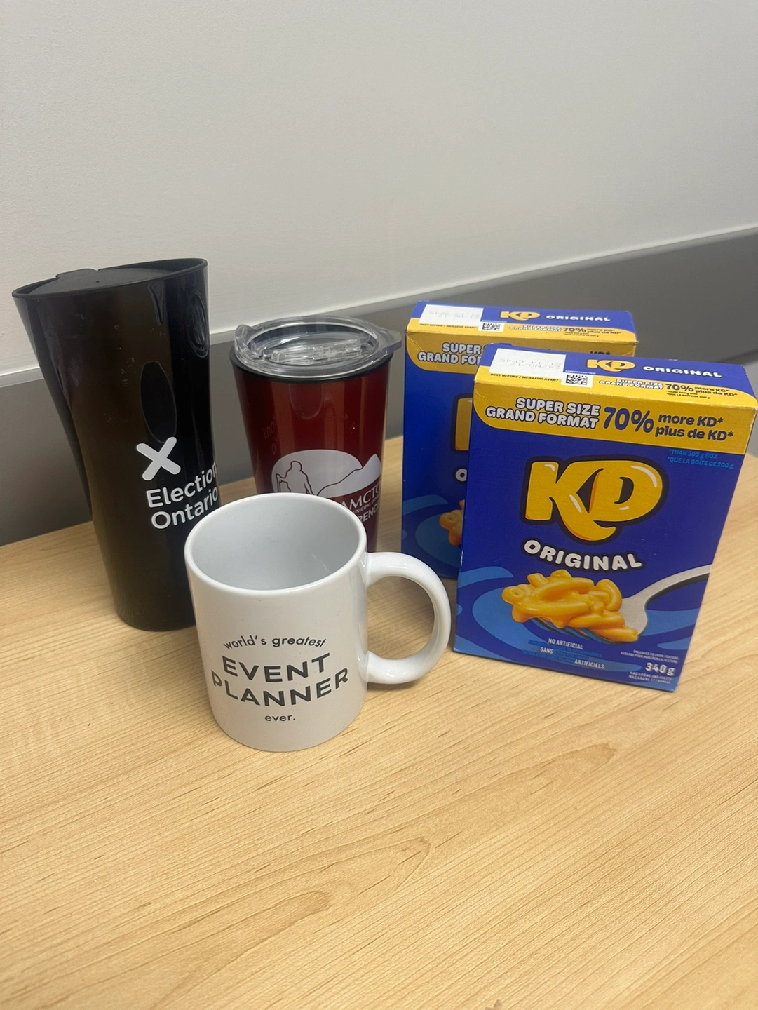 A set of three mugs and two boxes of KD. The mugs are in various styles and sizes. The boxes are both KD Original (New).