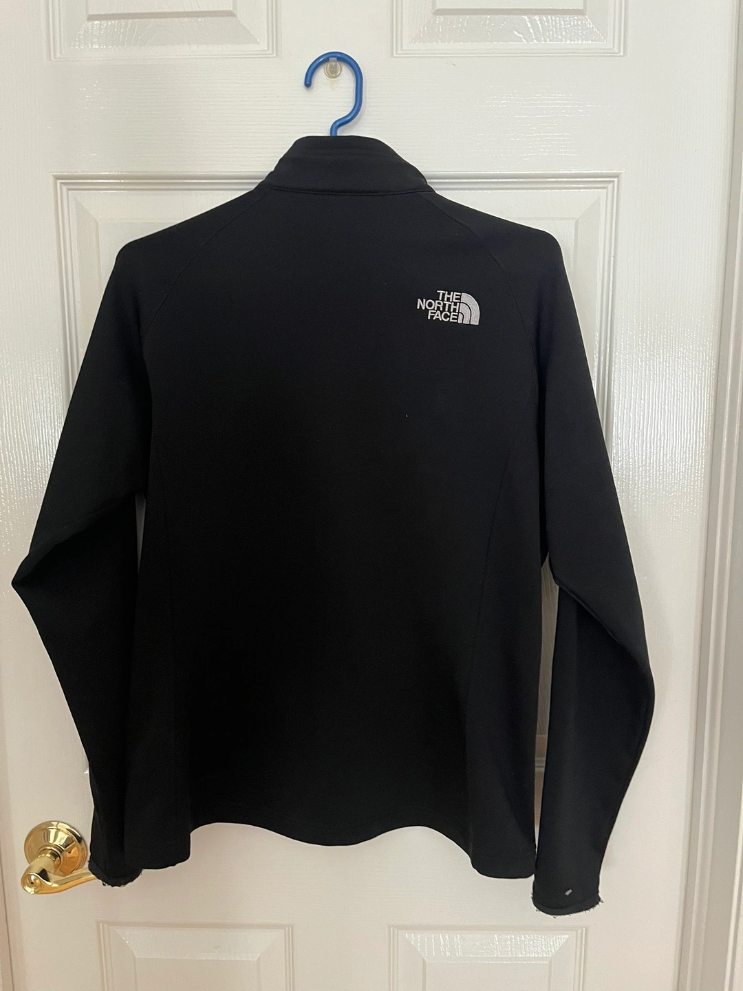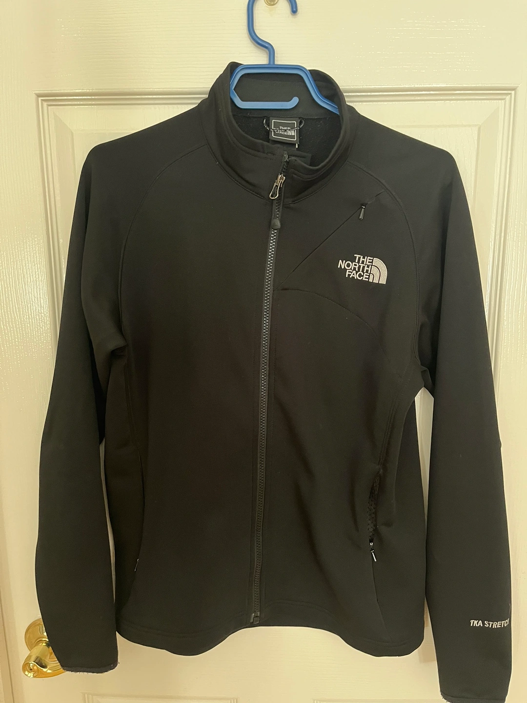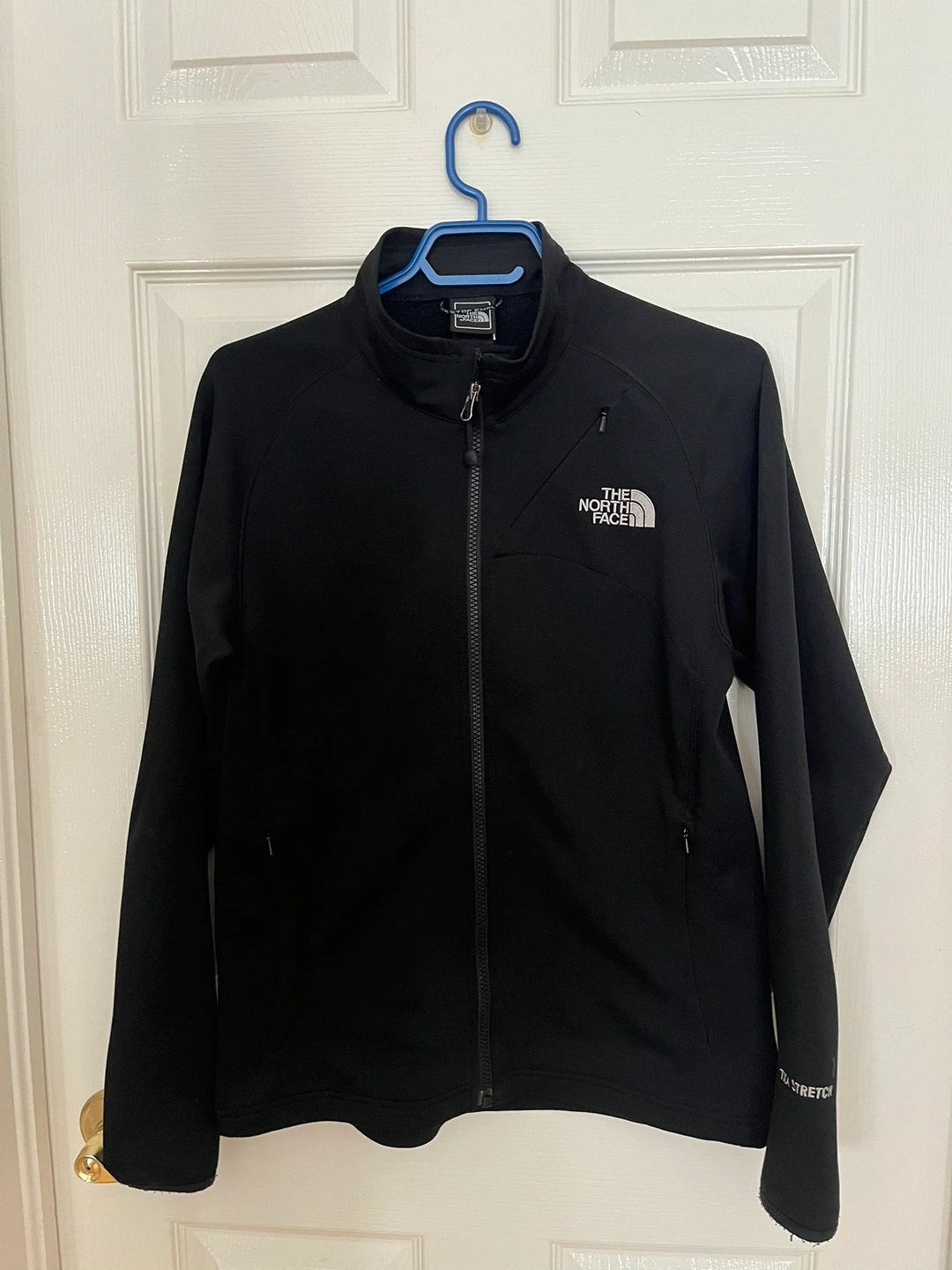 Black North Face jacket with a zipper closure. The jacket has a logo on the front and back. The jacket has two zippered pockets on the front. The jacket is made of a stretchy fabric.