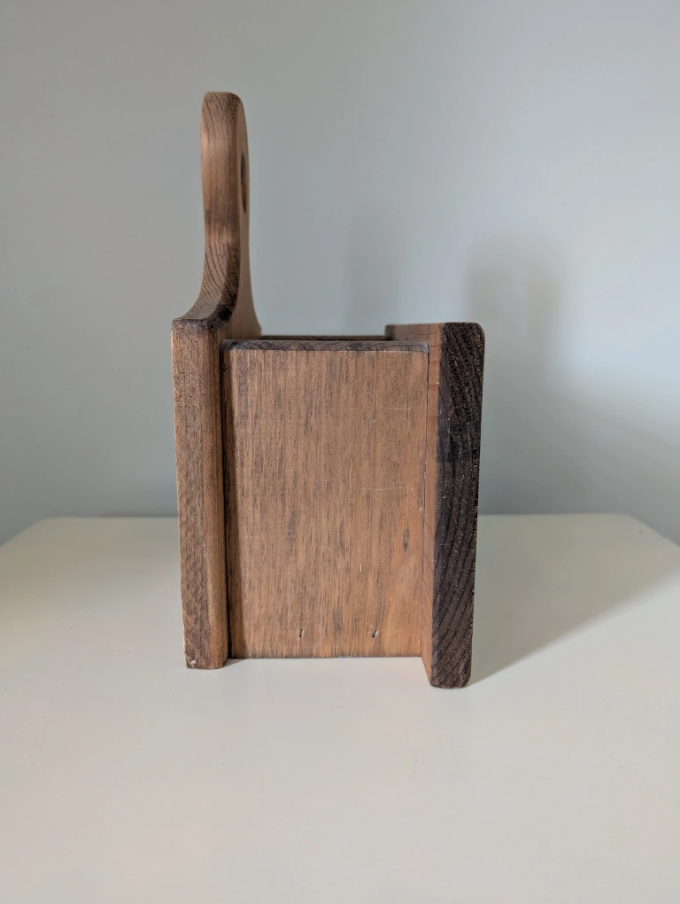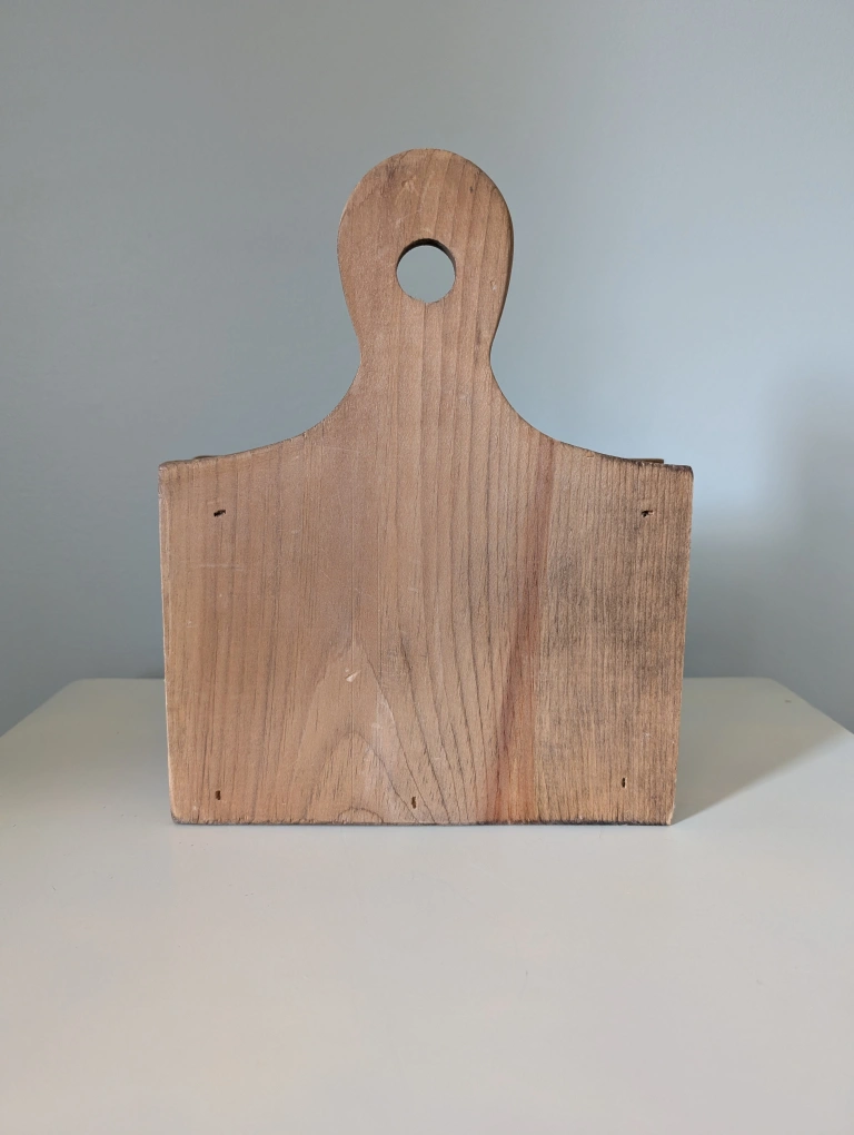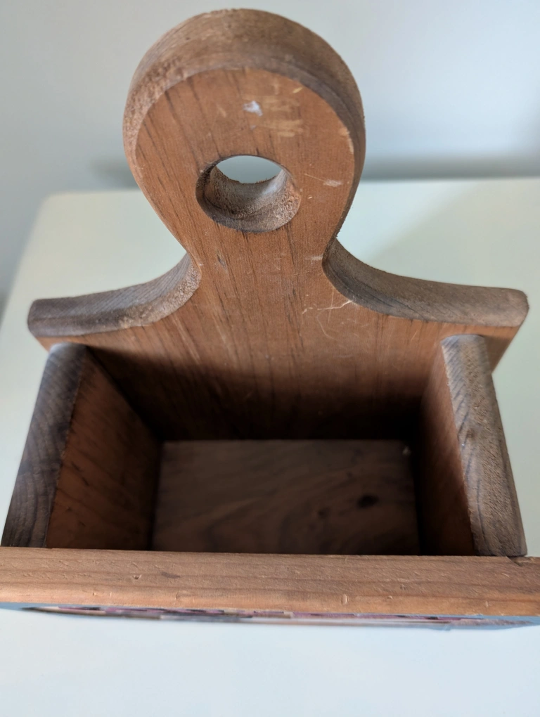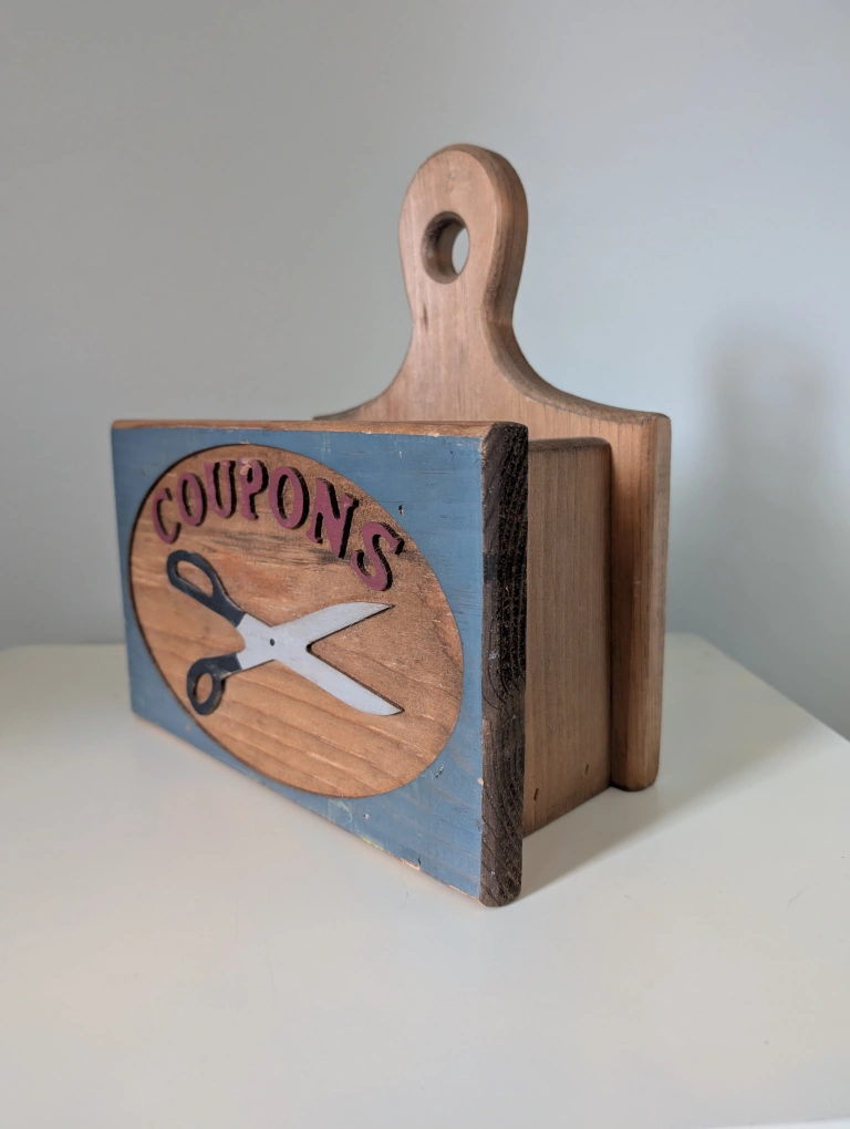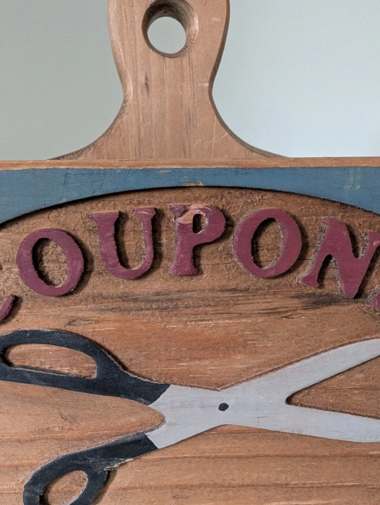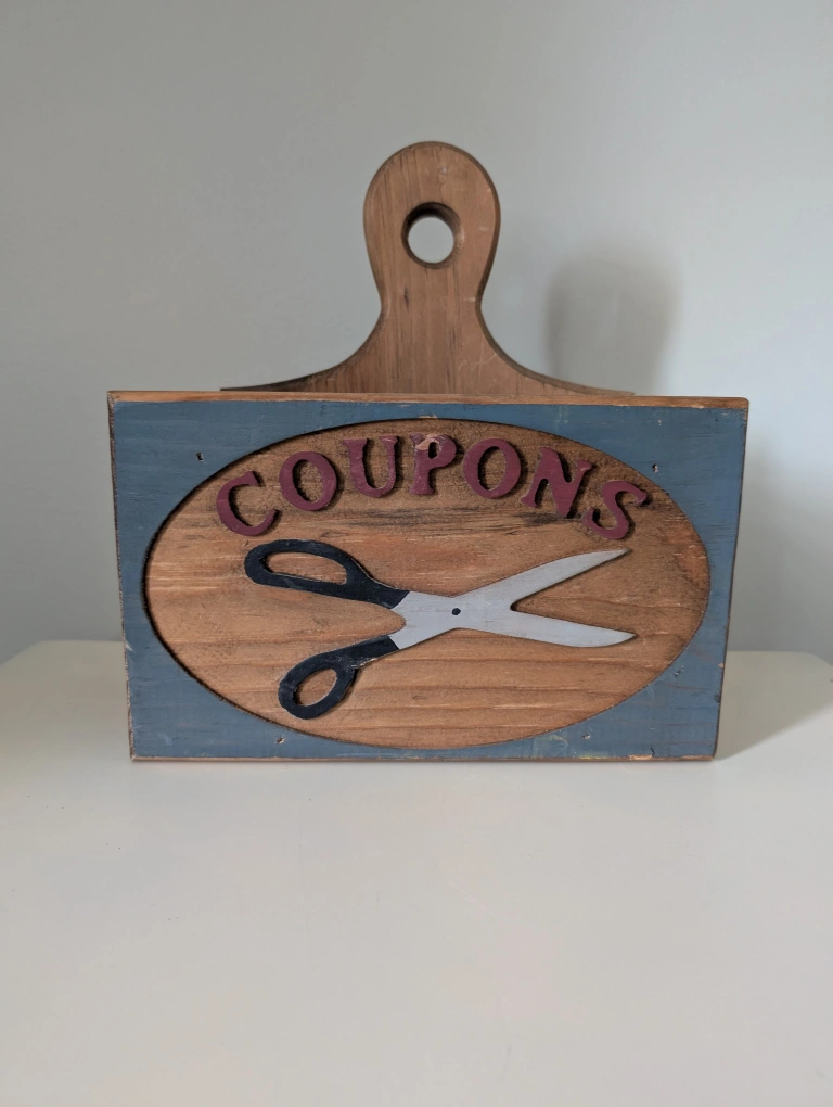 An original handmade vintage wooden coupon holder with a handle and an opening on the top. It features a painted design of scissors and letters spelling coupons. Solid wood. Original. Rustic decor. Demensions: 10 1/2" W x 11 1/2" H **small chip on the 'p' as noted in the photographs above. ➡️ Door pickup ➡️ Cash or e-transfer Day 3 - Post an item for $10 or less.