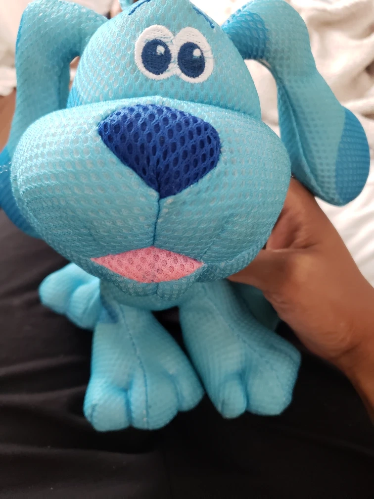 Plush toy of Blue from Blue's Clues. The toy is made of a mesh material and has a pink tongue. The toy is in used condition. fun bath toy