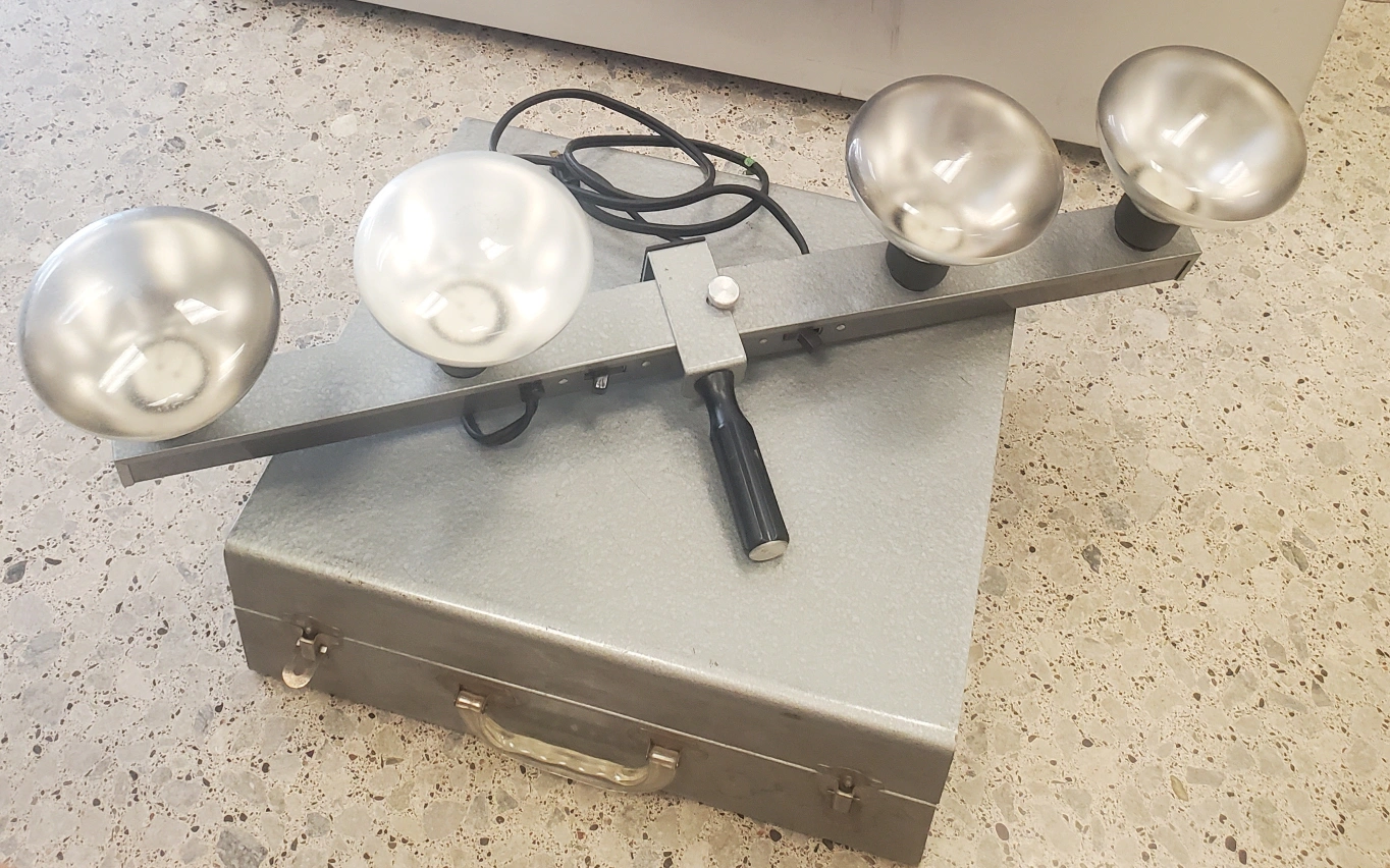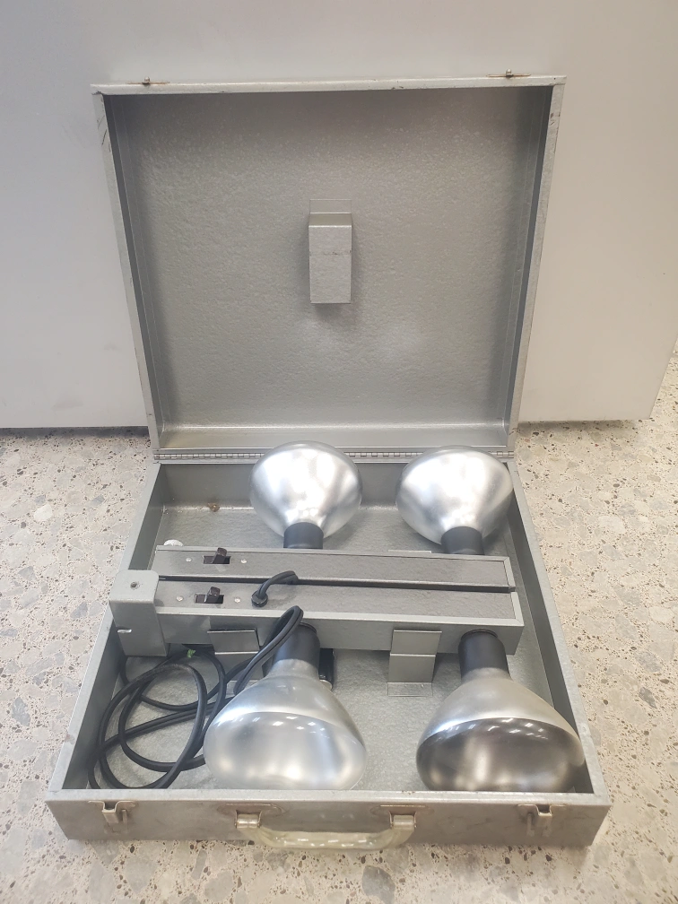 Bar measures 19 3/4” wide and 1 1/2” deep. Comes with nice metal original case in vintage condition gray color. Case measures 13”deep x 12” wide x 4 5/8” high. A couple of light scratches and minor fading on box, consistent with age and use, mostly in really awesome vintage condition! Plug is in great condition as is cord. Rare model! Vintage Photography Memorabilia. Pickup dufferin and Steeles area or delivery available for a fee.