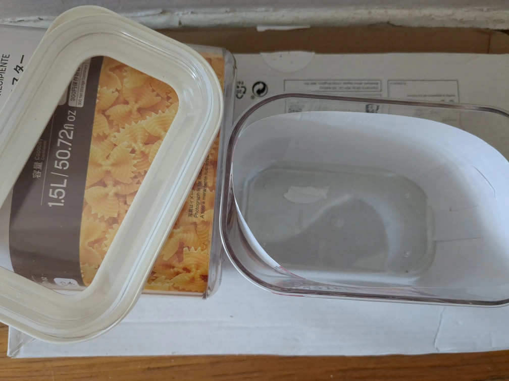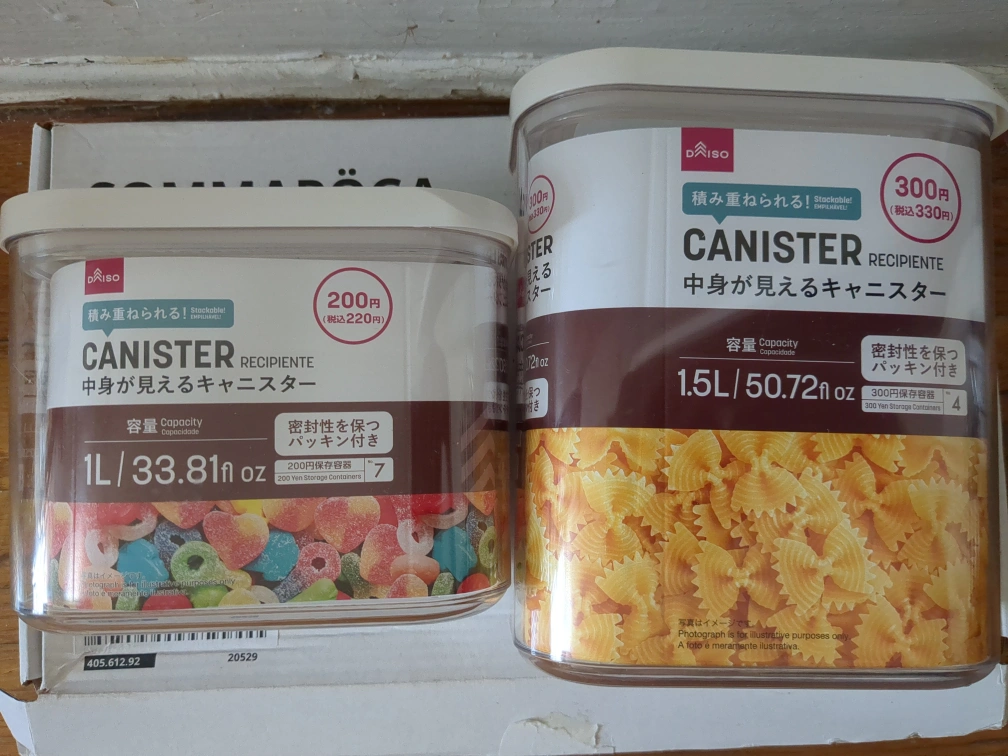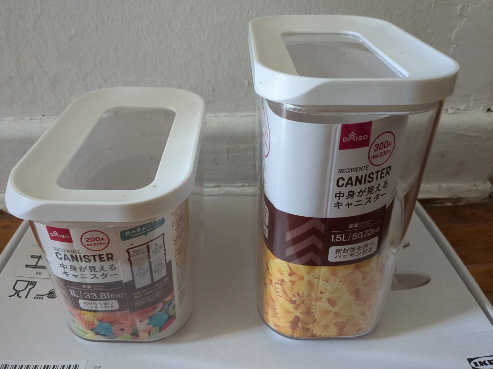 Set of 2 Daiso canisters with lids. The canisters are clear plastic. One is 1L, one is 1.5L and the other is 300ml. The lids are white.