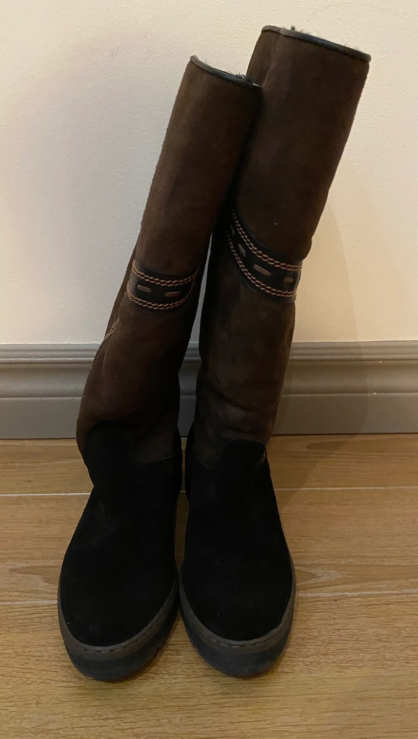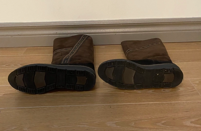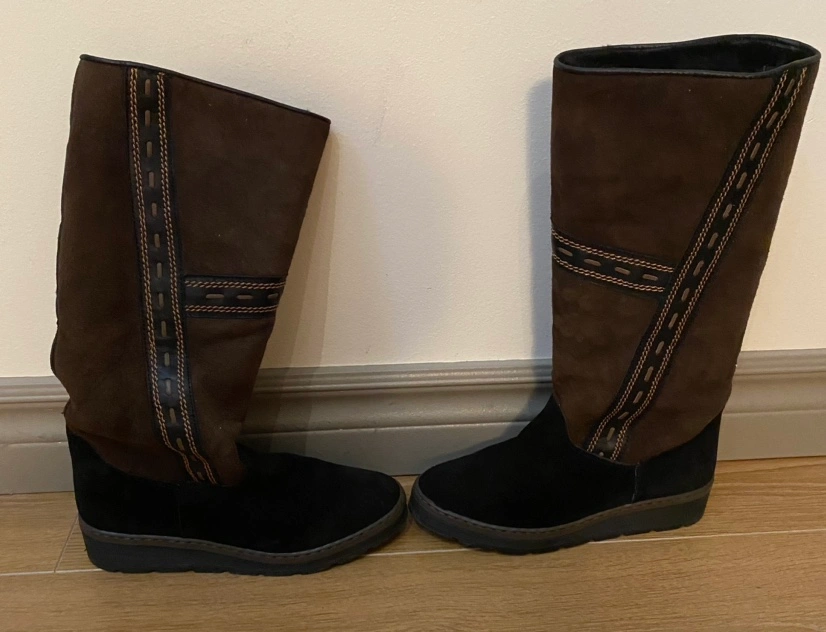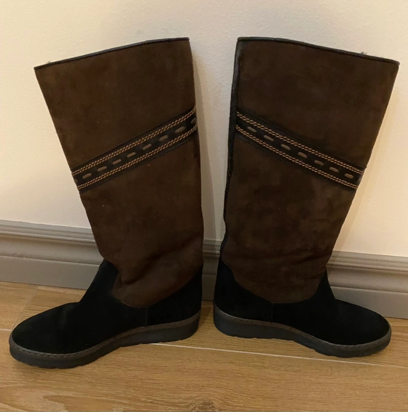 Knee-high brown suede boots with a black sole and decorative stitching. The boots with fur lining and is waterproof thus good for winter. Size: 36. There’s still a lot of life left.