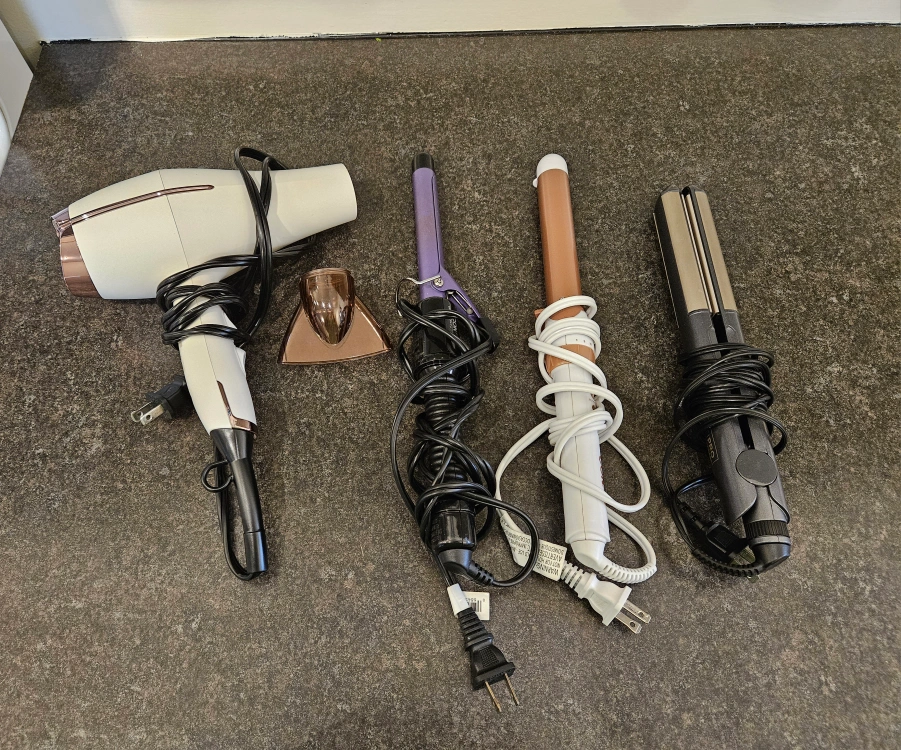 Set of four styling tools: hairdryer, 2 curling irons, and a straightener.