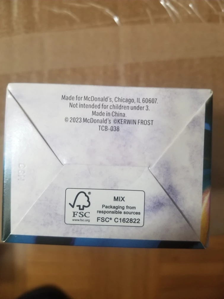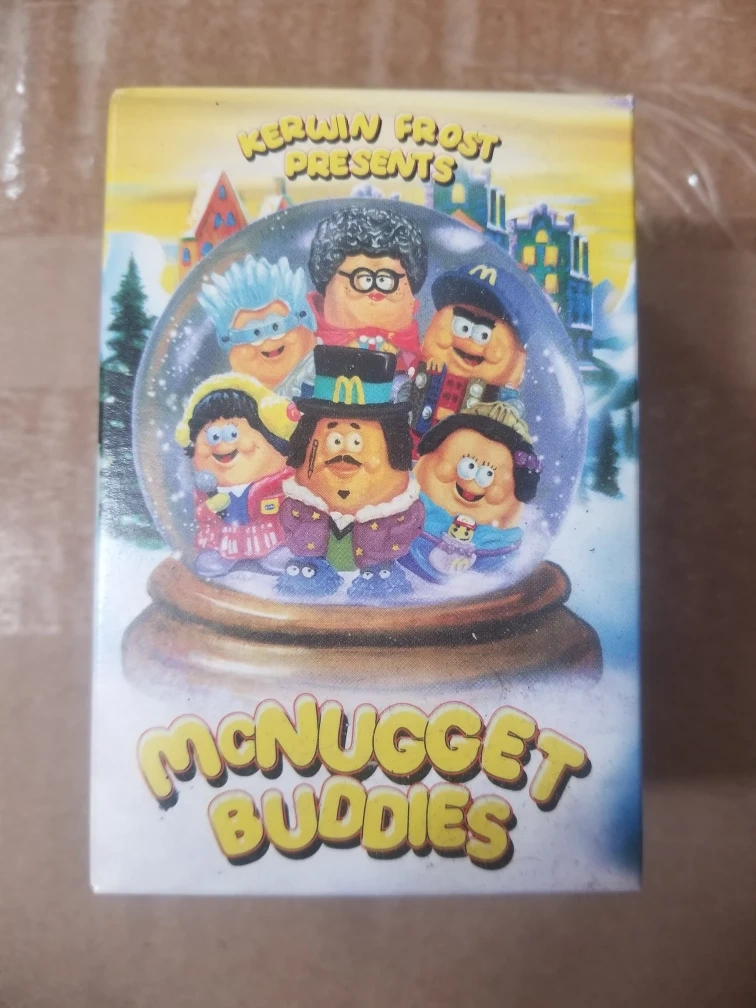 78A collectible Mcnugget Buddies snow globe. The snow globe features six characters from the Mcnugget Buddies collection: Waffutu, Kerwin Frost, Darla, Brrrrick, Uptown Moe, and Don Bernuse. The snow globe is in a clear plastic dome with a white base and the Mcnugget Buddies characters are inside. The snow globe is in a cardboard box.