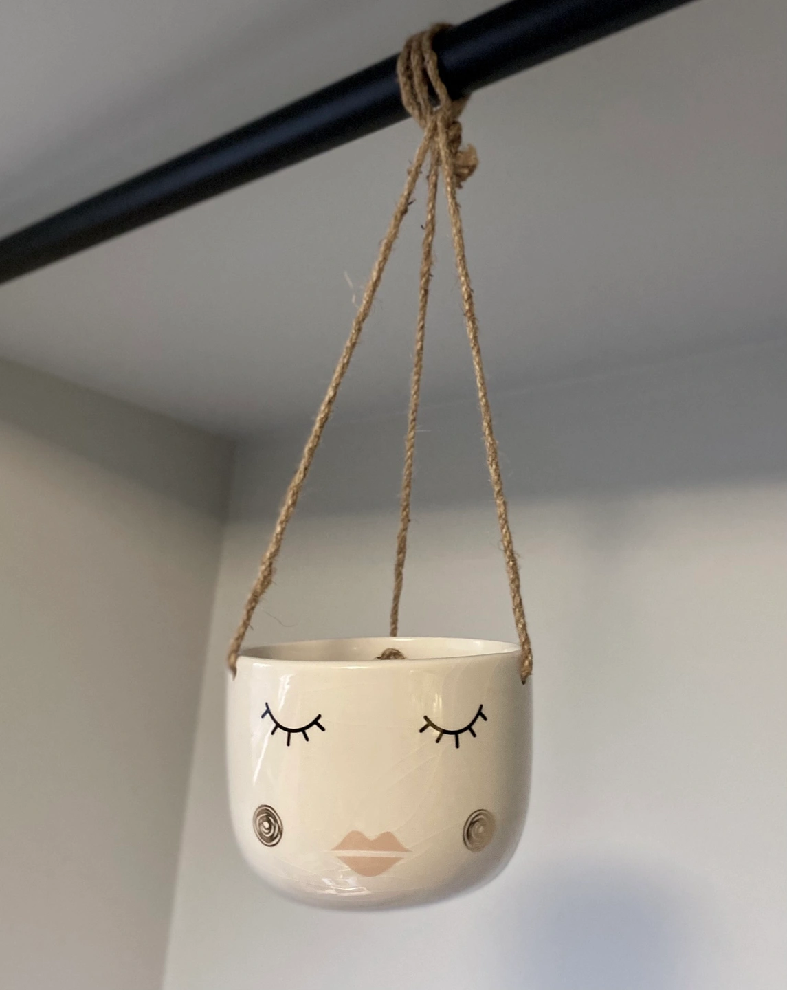 White ceramic planter with a face design. It has a jute rope for hanging.