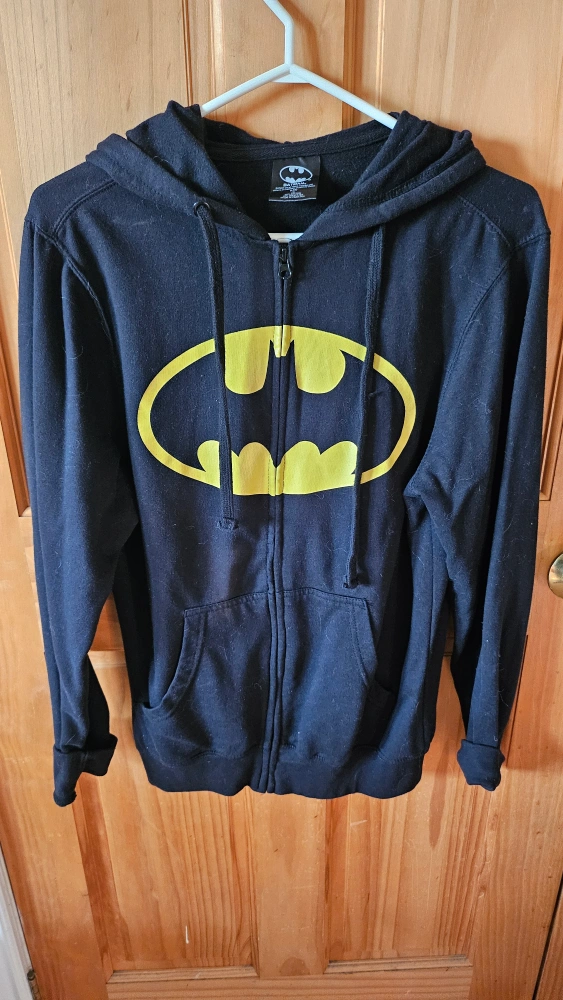 Black zip up hoodie with a yellow Batman logo. Size S. 60% cotton and 40% polyester. Made in Pakistan. Official Batman merch. Has been hanging in my closet, but essentially brand new (laundered). Available for pick-up near Oakwood Village.