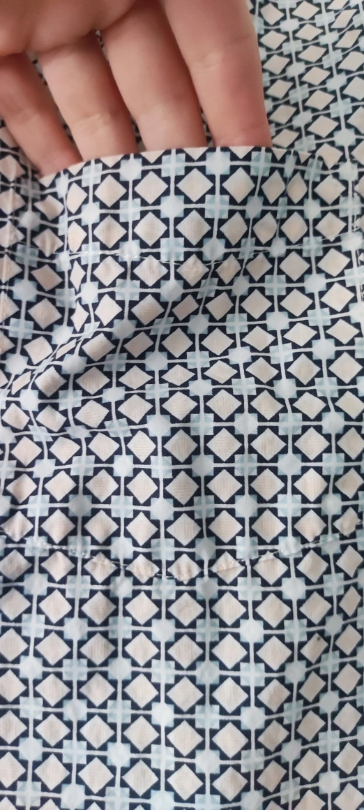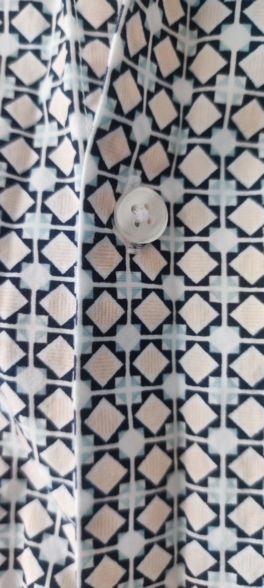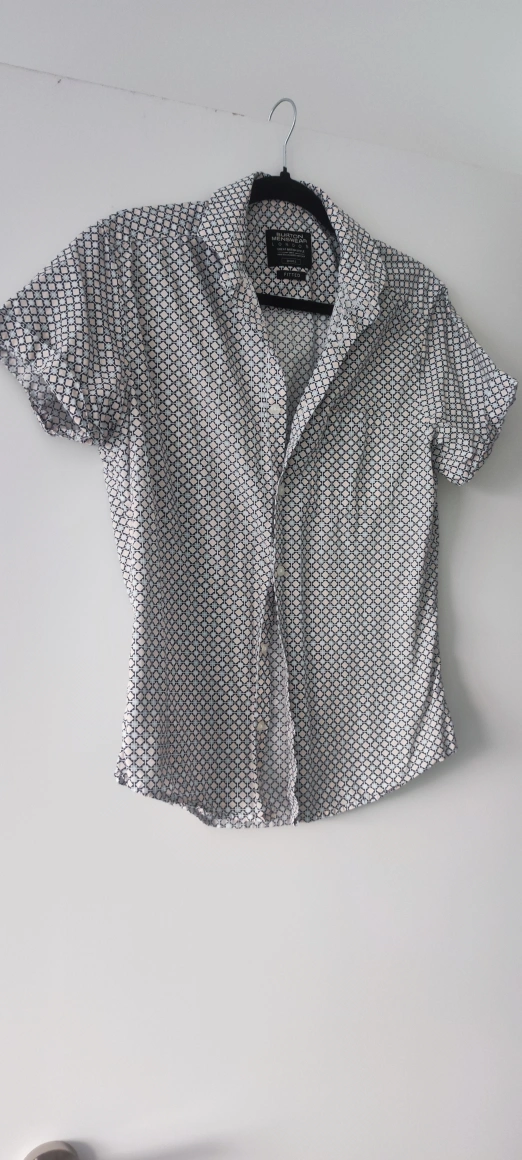 Short-sleeved button up shirt with a geometric print. The shirt has a single chest pocket. The shirt is size small. It is in a fitted style. The shirt is a light white and blue colour.