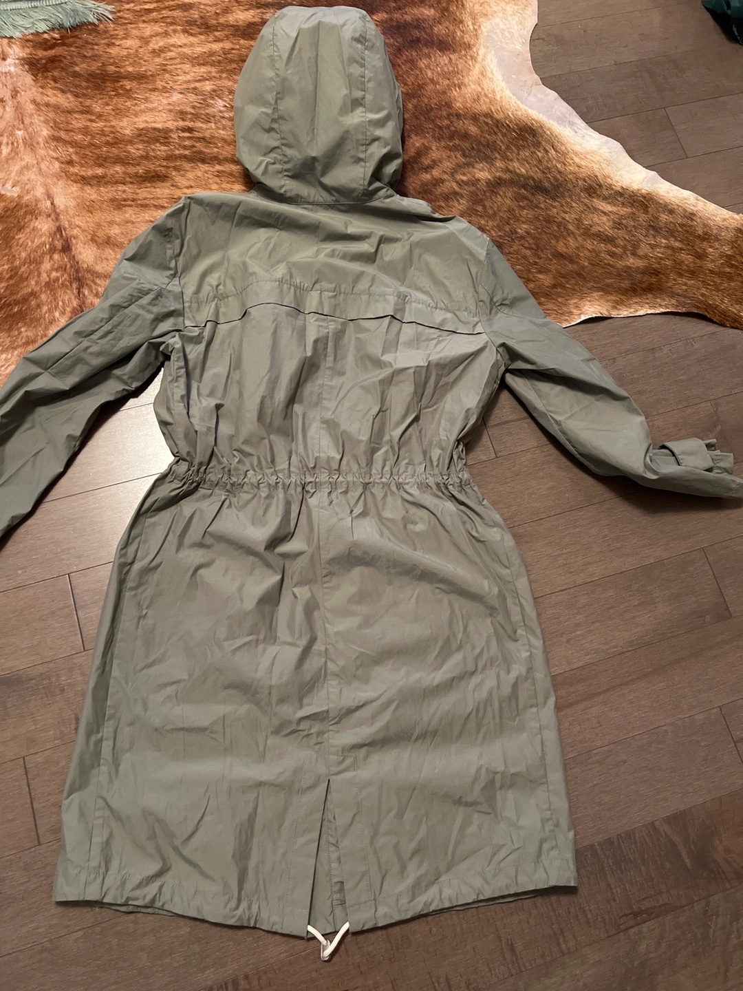 This is a green anorak jacket with a hood and drawstring waist. It has a zipper closure and two front pockets. It is size M.