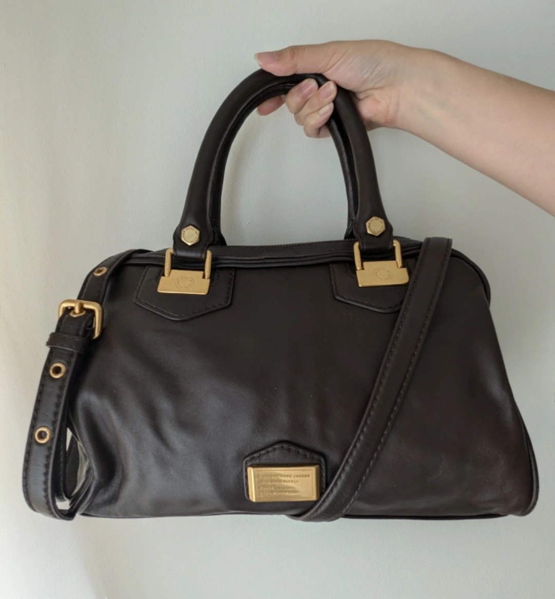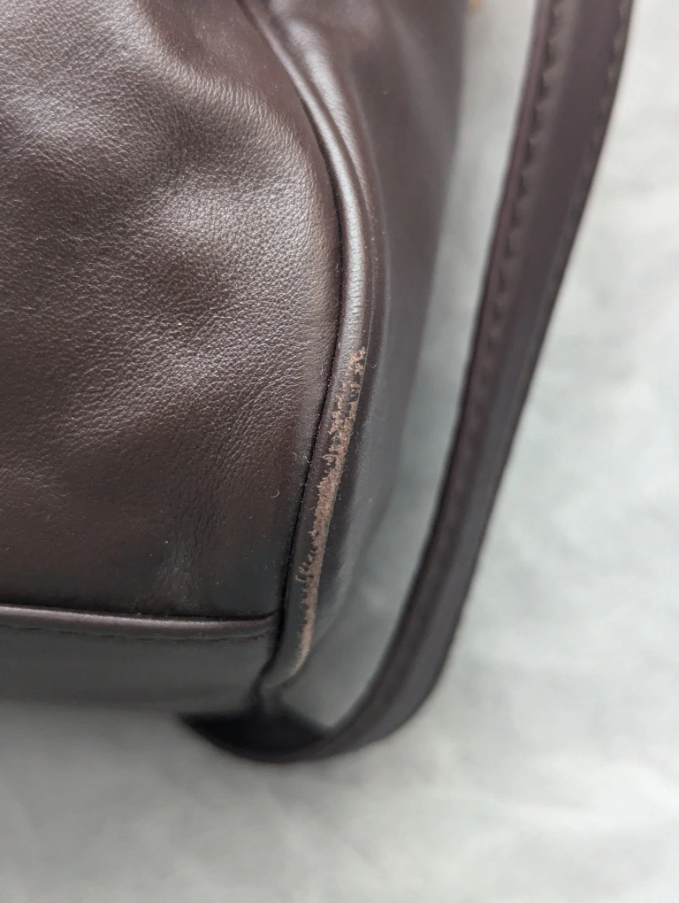 Beautiful soft leather in a dark chocolate brown and brass hardware. Strap can be removed as needed. Normal signs of use on the edges, which can easily be concealed with minor touch ups.