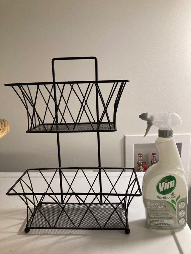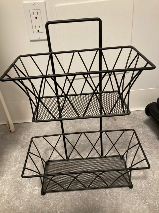 This wire basket has two tiers and is great for organizing small items. It would be great for use in a kitchen, bathroom, or bedroom.
