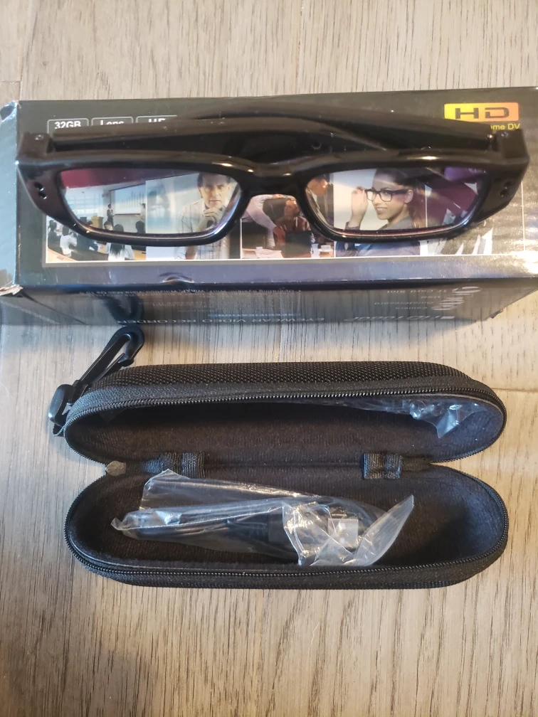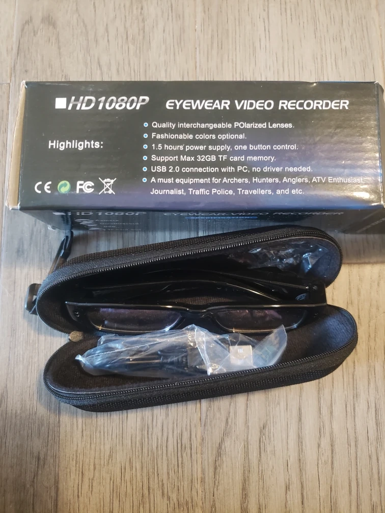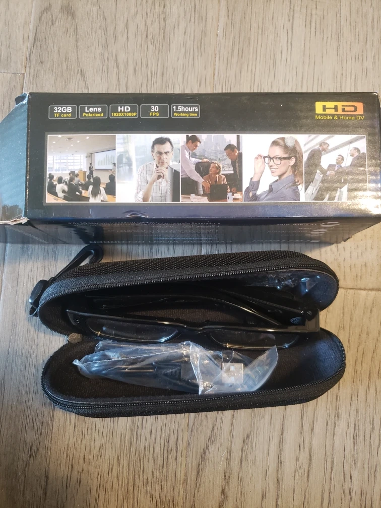 This item comes with a case and a USB charging cable. It appears to be a video recorder disguised as a pair of sunglasses. It has polarized lenses . It also features a one button control and a 1.5 hour recording time. It is a great way to capture video in a discreet way. no sd included $110 or best offer brand new never been used